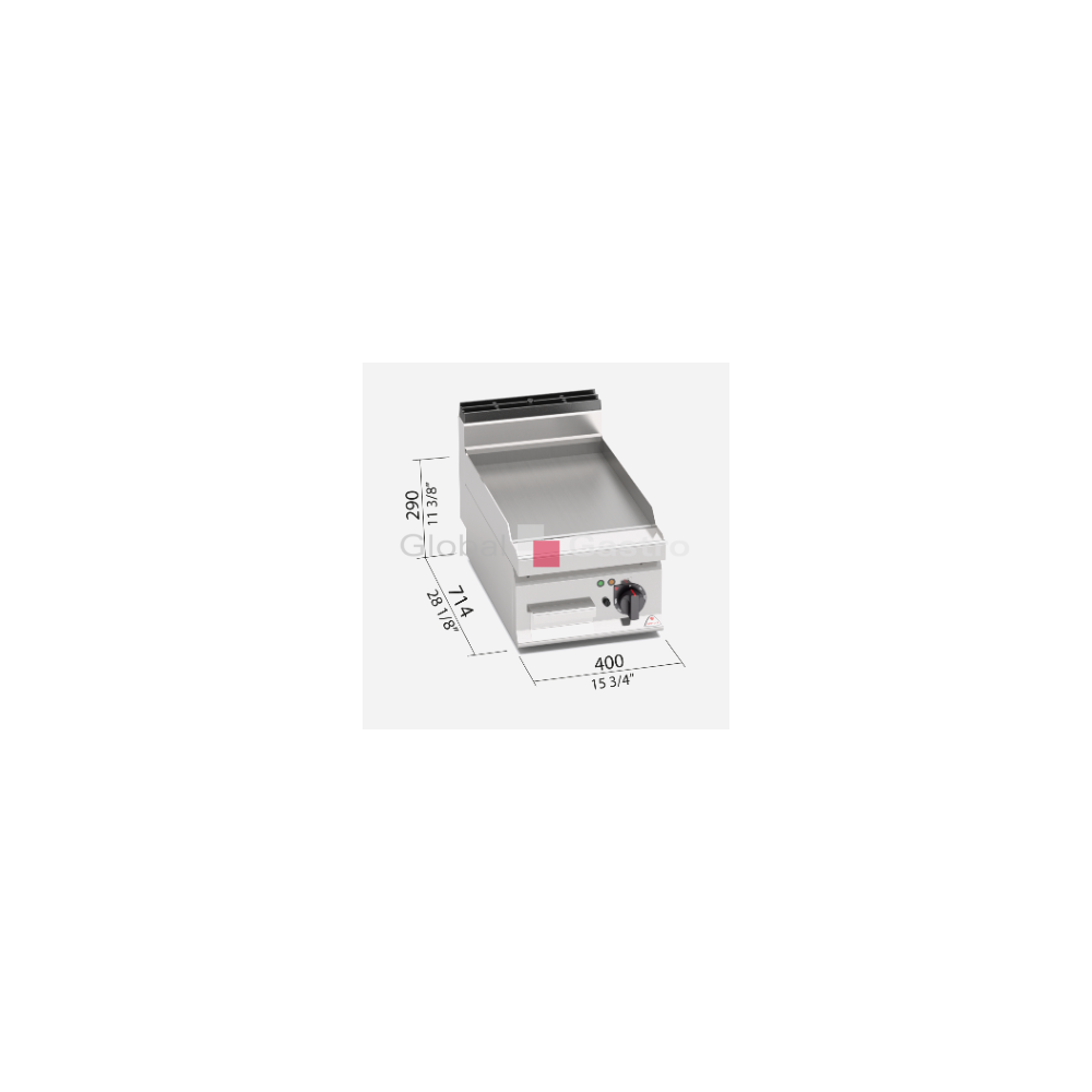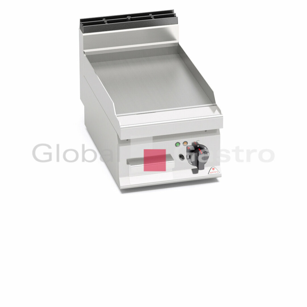 Zesílená grilovací deska s hladkým (rýhovaným) povrchem z oceli a zvýšenými postranními lemy. Topné těleso je umístěno pod grilovací plotnou. Regulační stupně umožňují nastavit teplotu 50-300°C