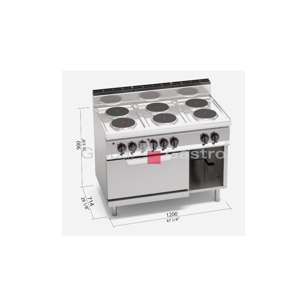 Pracovní plocha a opláštění z nerez oceli AISI 304. Litinová varné plotýnky s bezpečnostním termostatem a regulací výkonu. Kompaktní provedení s otevřeným podstavcem.