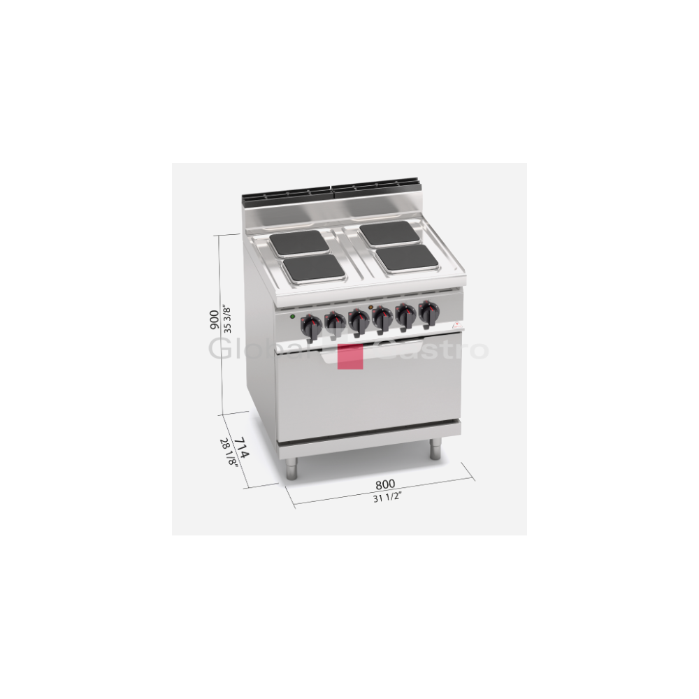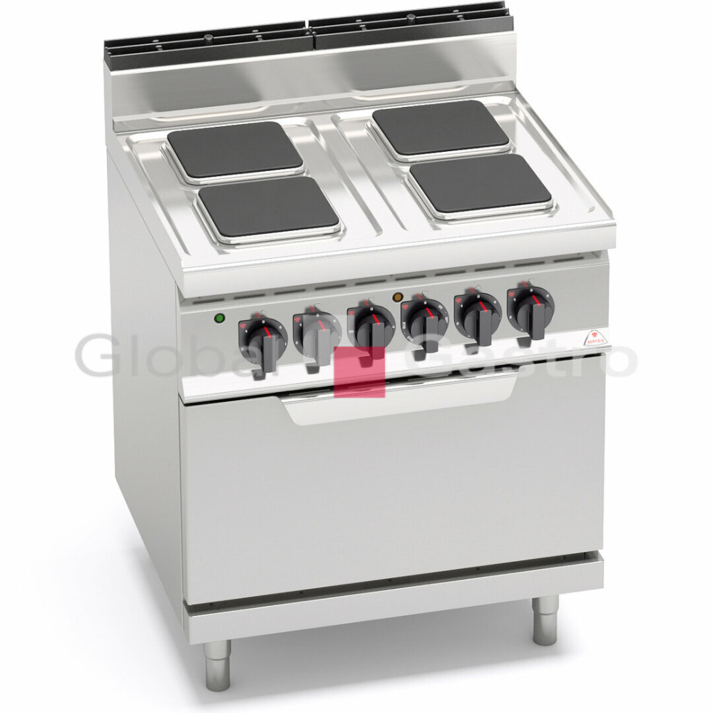 Sporák s troubou je vybaven varnými plotýnkami z litiny. Pracovní plochu lze doplnit o ocelovou výplň prostoru mezi plotnami, čímž se dosáhne celistvé pracovní plochy. Teplota je regulována nezávisle nastavitelnými spínači. Přímá kontrola teploty umožňuje významně uspořit energie. Topná tělesa jsou hermeticky uzavřena v jednom celku, který je lisován v rovině do varné desky. Pracovní plocha a opláštění z nerez oceli AISI 304. Litinová varné plotýnky s bezpečnostním termostatem a regulací výkonu. Kompaktní provedení s otevřeným podstavcem. Konvekční trouba vhodná pro GN 1/1, nebo model se statickou multifunkční troubou pro GN 2/1. Trouby mají nově zesílené litinové dno a jsou vybaveny kvalitním těsněním dveří.