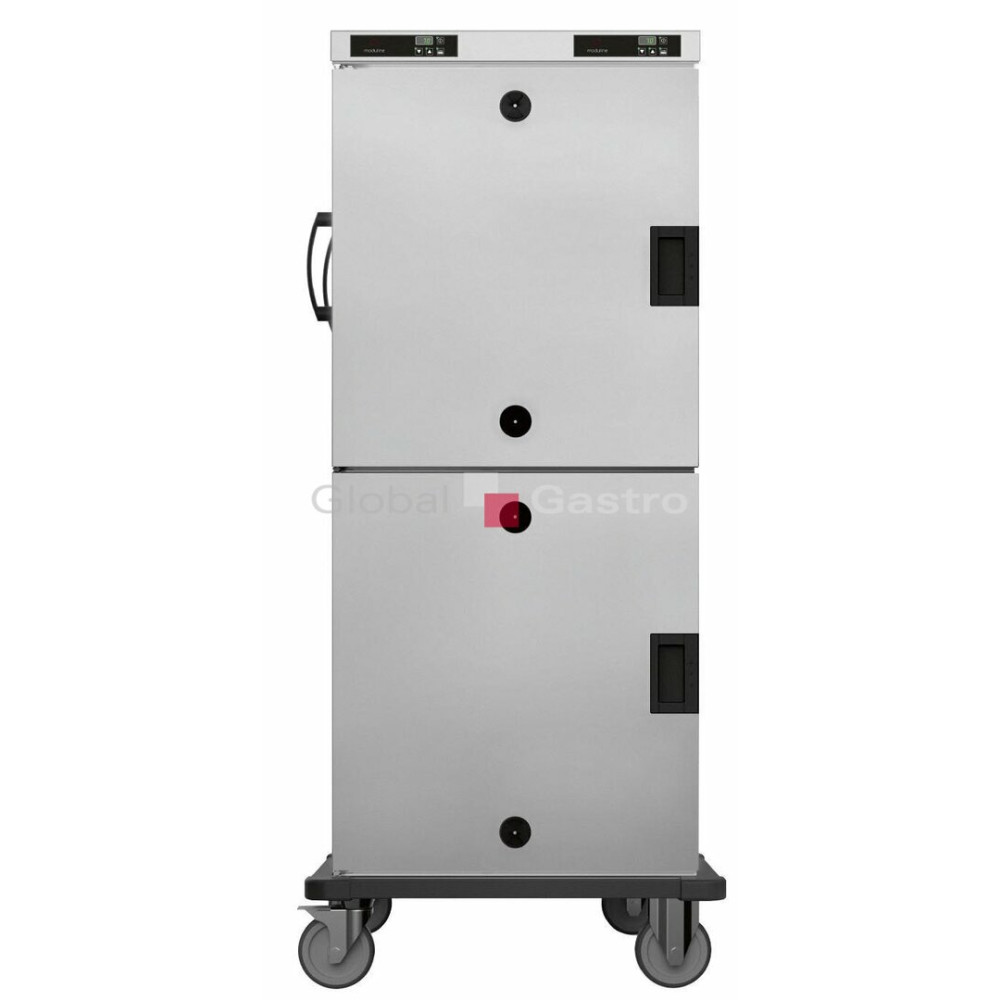 Transportní vozík HHT-282E slouží pro udržování potravin v teplém stavu. Přesné elektronické nastavování teploty od 30 – 120°C. Ve dveřích umístěny dva ventilační otvory pro manuální odvlhčení komory. Statický kruhový topný systémem šetrného ohřevu využívána udržuje optimální vlhkost uložených potravin. Kvalitní těsnění komory, oválné rohy, vyjímatelné vnitřní zásuvy. Rozdělené dveře a samostatně oddělené komory pro snížení tepelných ztrát při otevírání a regulaci teploty v každé komoře samostatně. Dveřes možností změny otevírání vlevo či vpravo a vybaveny odolným těsněním. Ochrana rohů z plastu. Robustní kola 4x150mm, dvě z nich brzděná. Ergonomické madlo pro snadnou ovladatelnost vozíku. Snadná servisní údržba.