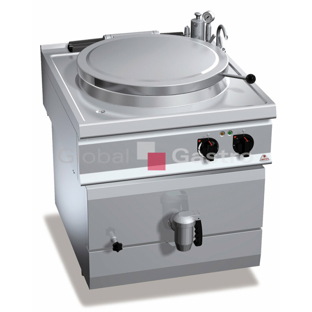Nepřímý ohřev s nízkotlakou párou (0,5 bar) generovanou v meziplášti vybaveném bezpečnostním termostatem. Topné těleso z oceli Incoloy je umístěno v ochraném pouzdře z nerez oceli. Mechanický ukazatel tlaku umístěný ve vnějším opláštění. 3-polohové ovládání výkonu a regulace teploty pomocí termostatu. Ve standardu automatické dopouštění vody do dvoupláště.