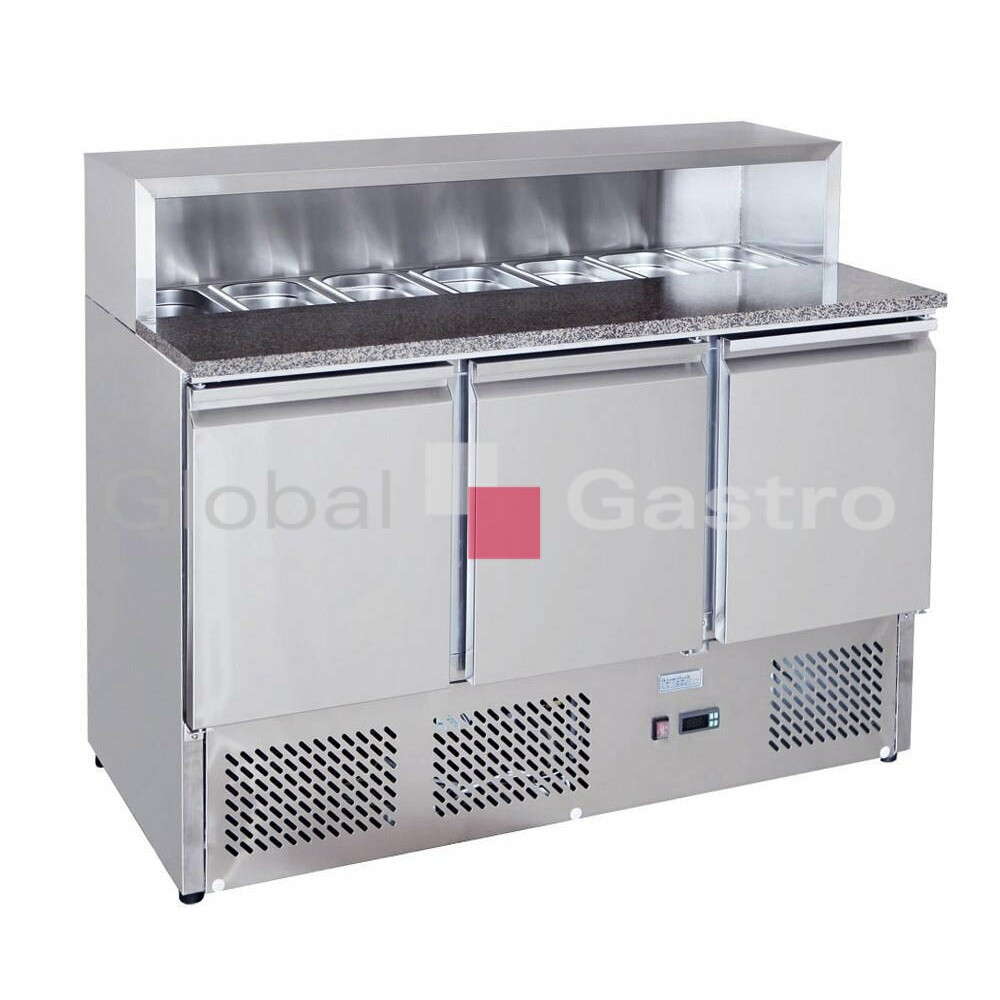 Celonerezové provedení s plnými dveřmi, vrchní nerezový hygienický zákryt a žulová pracovní deska. Vnitřní roštová police GN1/1 (1x ve dveřích). Vrchní deska je tvořena z poloviny žulovou pracovní deskou a v zadní části stolu je chlazený otvor pro vložení GN1/3 s ingrediencemi (vychlazovány ze spodní částí chlazeného stolu, GN nejsouv ceně).