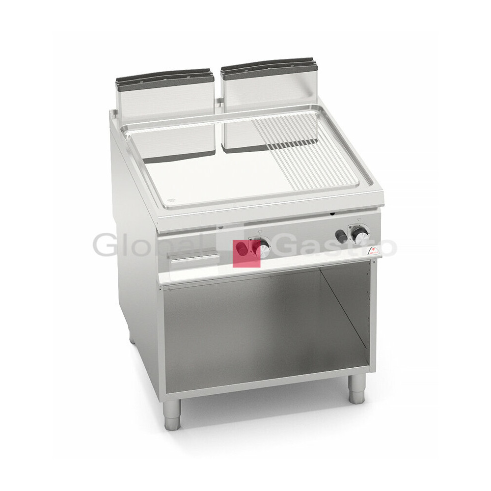 Termostatický ventil 30 až 300°C pro přesnou a bezpečnou regulaci. Termočlánek a chráněný zápalný plamínek. Dvě zóny s nezávislým ovládáním a přesnou regulací teploty. Dvojvrstvá grilovací plotna složená z ocelového plátu a horní vrstvy z nerez oceli AISI 316 s leštěným povrchem, který umožňuje snadné čištění. Nízká úroveň odlesku zvyšuje komfort při práci. Zvýšené postranní lemy. Kompaktní provedení s otevřeným podstavcem. Zvýšený odtah 120 mm není součástí !