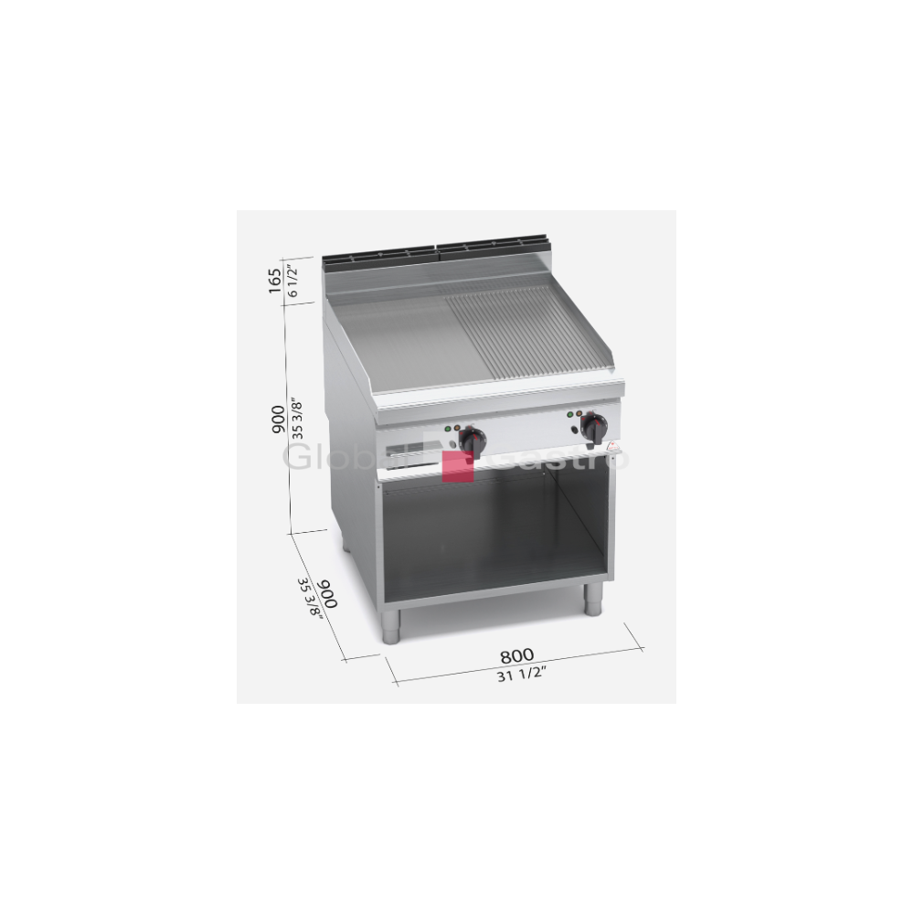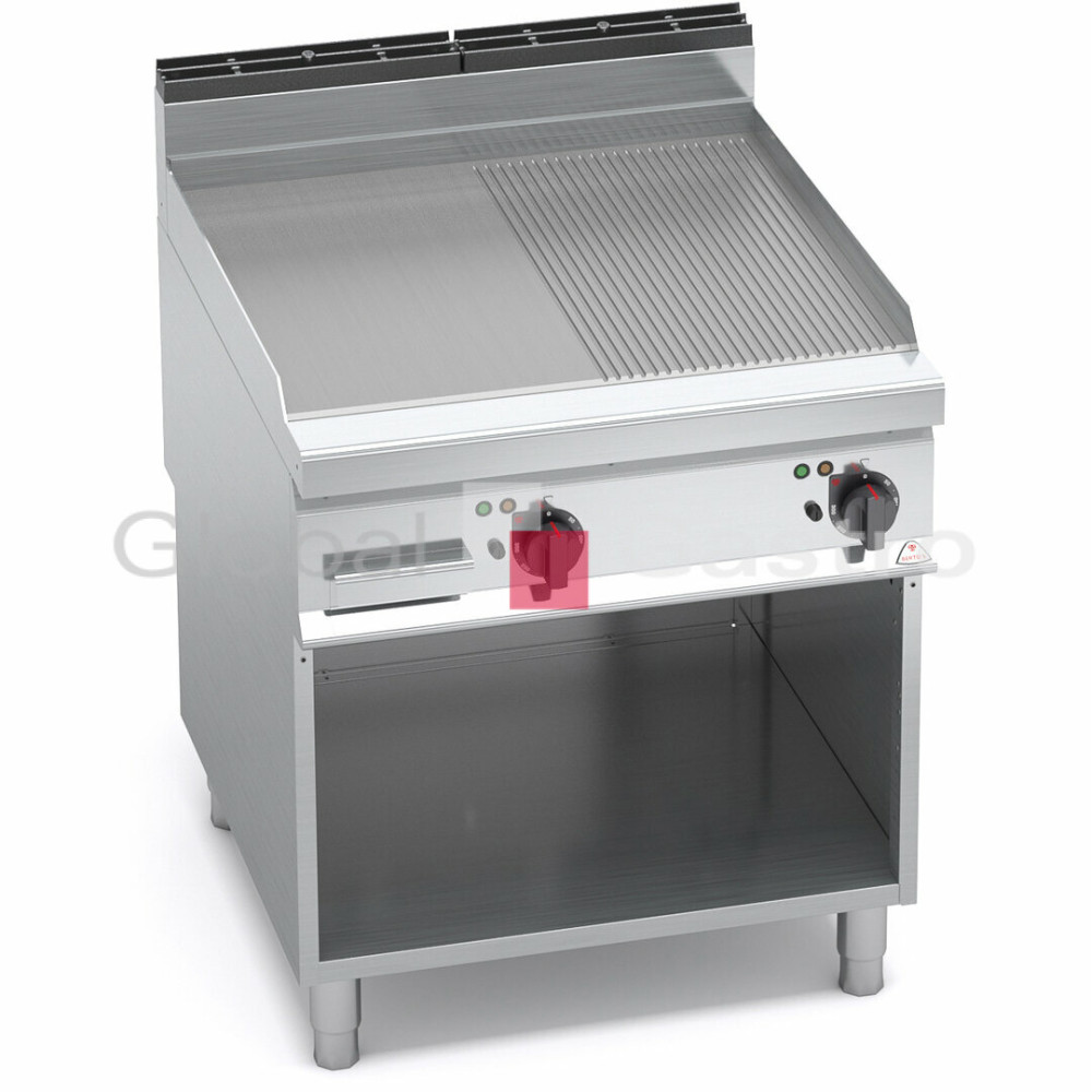 Topné těleso je umístěno pod grilovací plotnou. Deska o velké tloušťce s hladkým (rýhovaným) povrchem z oceli a zvýšenými postranními lemy. Kompaktní provedení s otevřeným podstavcem.