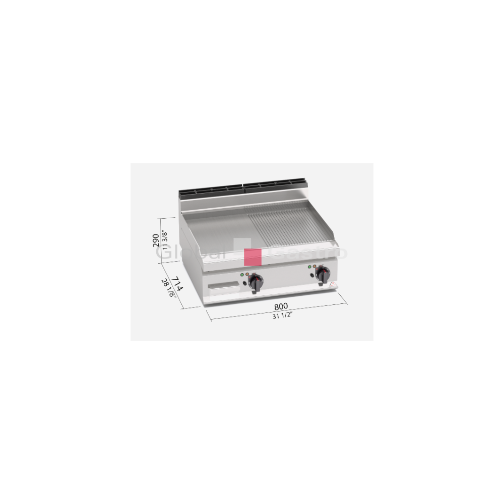 Zesílená grilovací deska s hladkým (rýhovaným) povrchem z oceli a zvýšenými postranními lemy. Topné těleso je umístěno pod grilovací plotnou. Dvě nezávislé zóny, regulační stupně umožňují nastavit teplotu 50-300°C. Kompaktní provedení s otevřeným podstavcem.