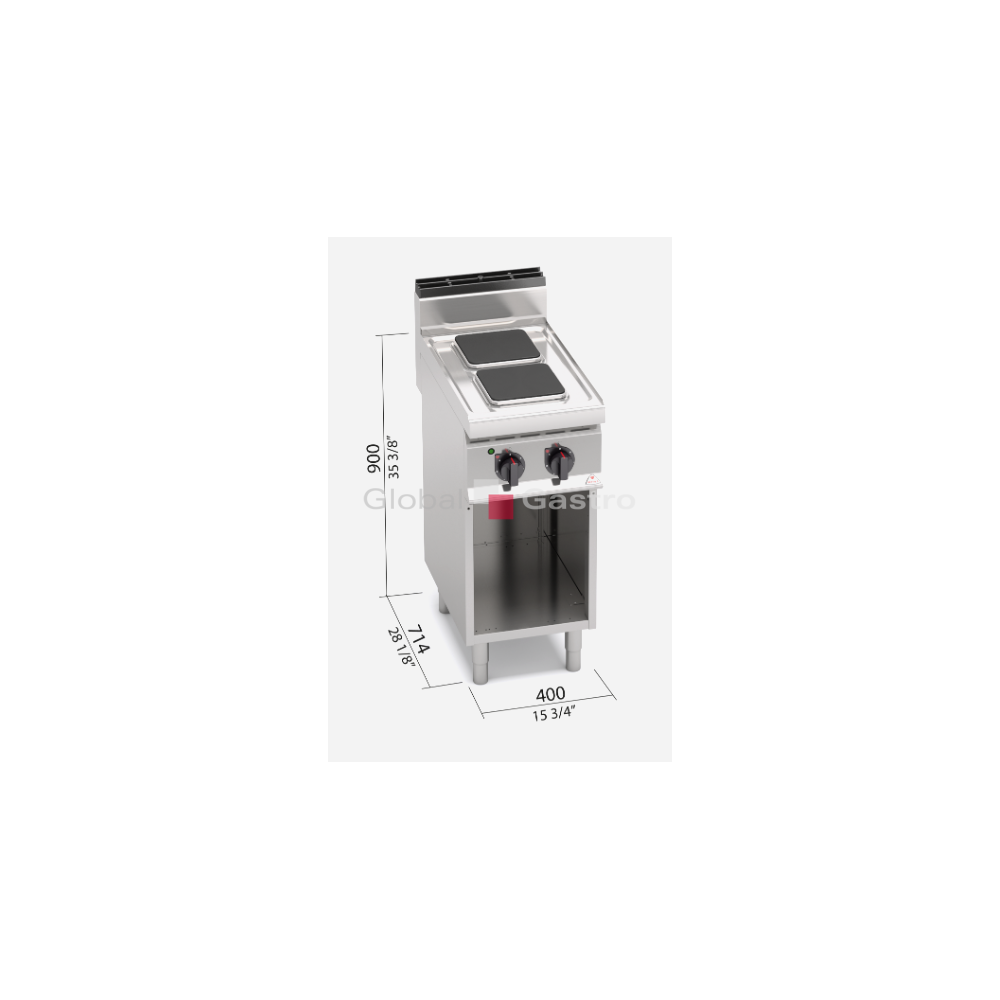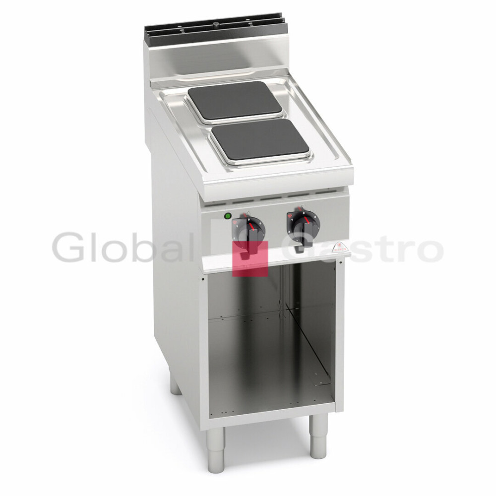 Pracovní plocha a opláštění z nerez oceli AISI 304. Litinová varné plotýnky s bezpečnostním termostatem a regulací výkonu. Kompaktní provedení s otevřeným podstavcem.