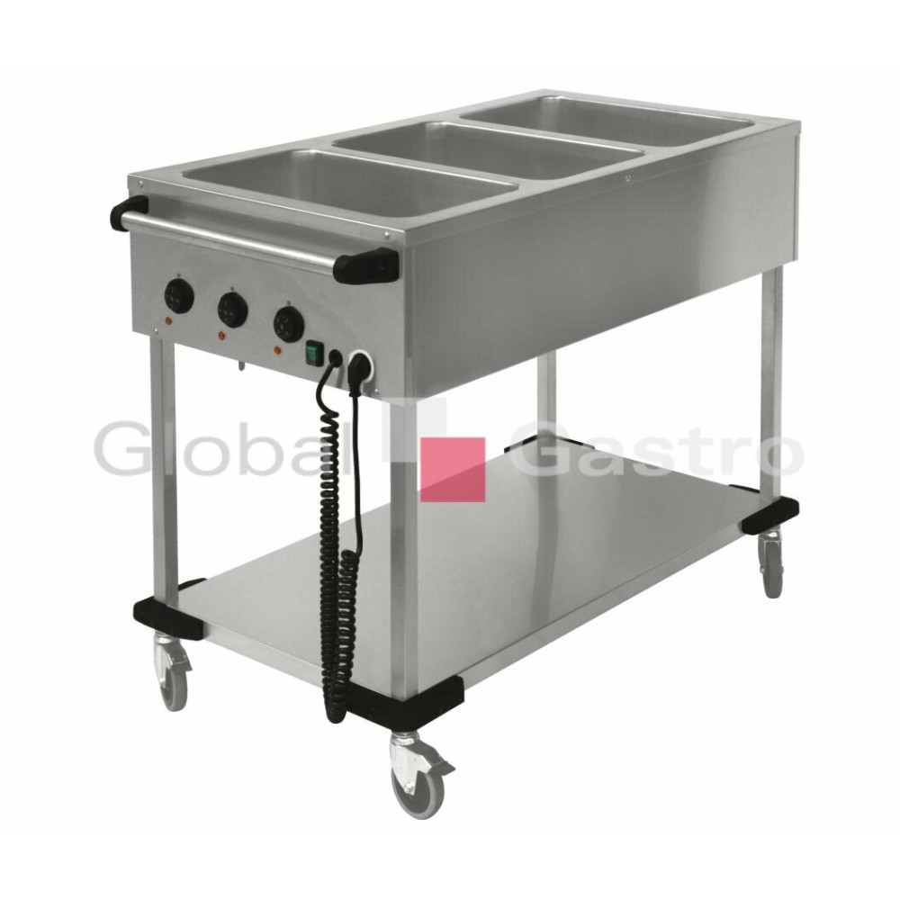 Celonerezový pojízdný výdejní stůl s vyhřívanou vodní lázní, v robustním provedení bez, nebo se spodní policí pevně spojenou s nohami, které jsou osazeny pojezdovými kolečky (2x brzděná). Vrchní deska s jednotlivými lisovaným vanami, každá samostatně regulována a vybavena výpustným ventilem.
