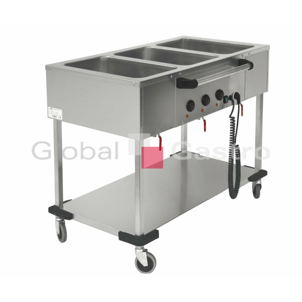 Celonerezový pojízdný výdejní stůl s vyhřívanou vodní lázní, v robustním provedení bez, nebo se spodní policí pevně spojenou s nohami, které jsou osazeny pojezdovými kolečky (2x brzděná). Vrchní deska s jednotlivými lisovaným vanami, každá samostatně regulována a vybavena výpustným ventilem.