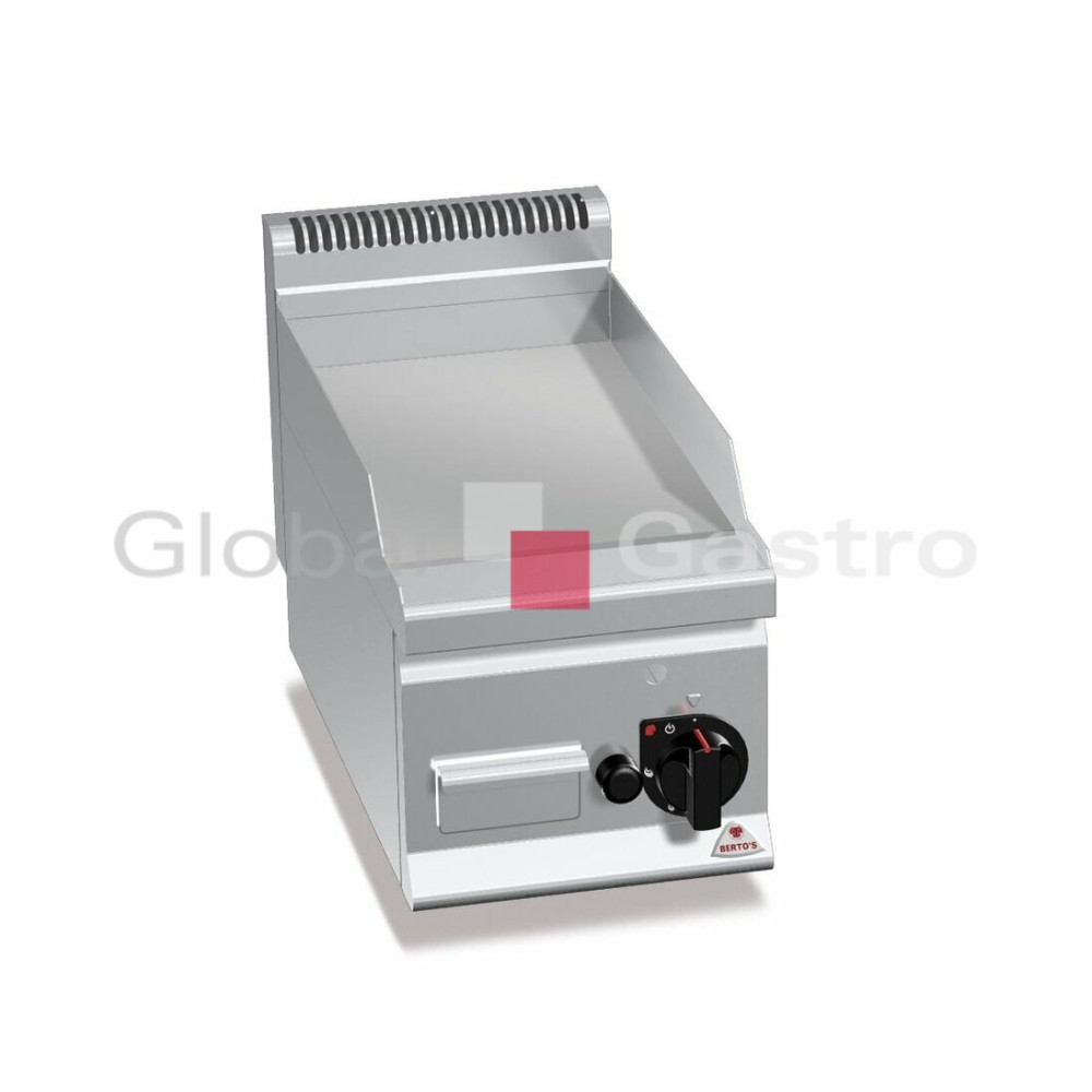 Termostatický ventil 30 až 300°C pro přesnou a bezpečnou regulaci. Termočlánek a chráněný zápalný plamínek. Deska s hladkým (rýhovaným) povrchem z oceli a zvýšenými postranními lemy.