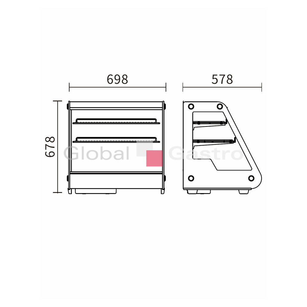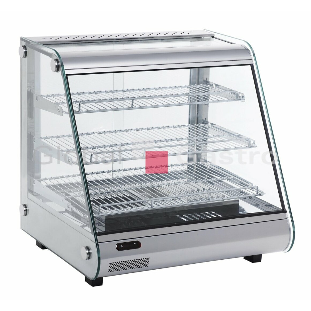 Vyhřívaná panoramatická vitrína s pevným uložením polic, určena k prezentací pokrmů. Vitrína je v elegantním nerezovém provedení ze všech stran prosklená s intenzivním LED osvětlením, které napomáhá prezentaci a prodeji potravin ve všech patrech. Posuvné dveře ze strany obsluhy. Vitrína je ovládána mechanickým termostatem (od 30 do 90°C) a mechanickým teploměrem na čelním panelu. V základní výbavě jsou tři chromové police a zásuvka pro mechanické přivlhčení.