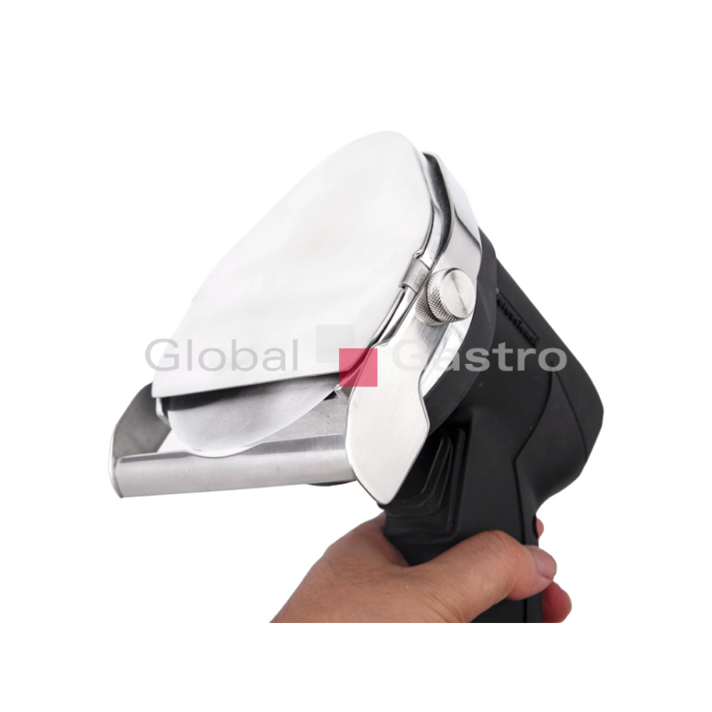 Profesionální elektrický nůž na gyros-kebab. Je určen pro snadné, přesné krájení/seřezávání grilovaného vepřového, nebo kuřecího masa připraveného na gyros grilech. Snadná regulace a nastavení požadované tloušky krájení. Bezpečné spouštění umístěno na ergonomické rukojeti, bezpečnostní kryt nože, tepelná ochrana s pojistkou. Délka přívodního kabelu 2,8 m.