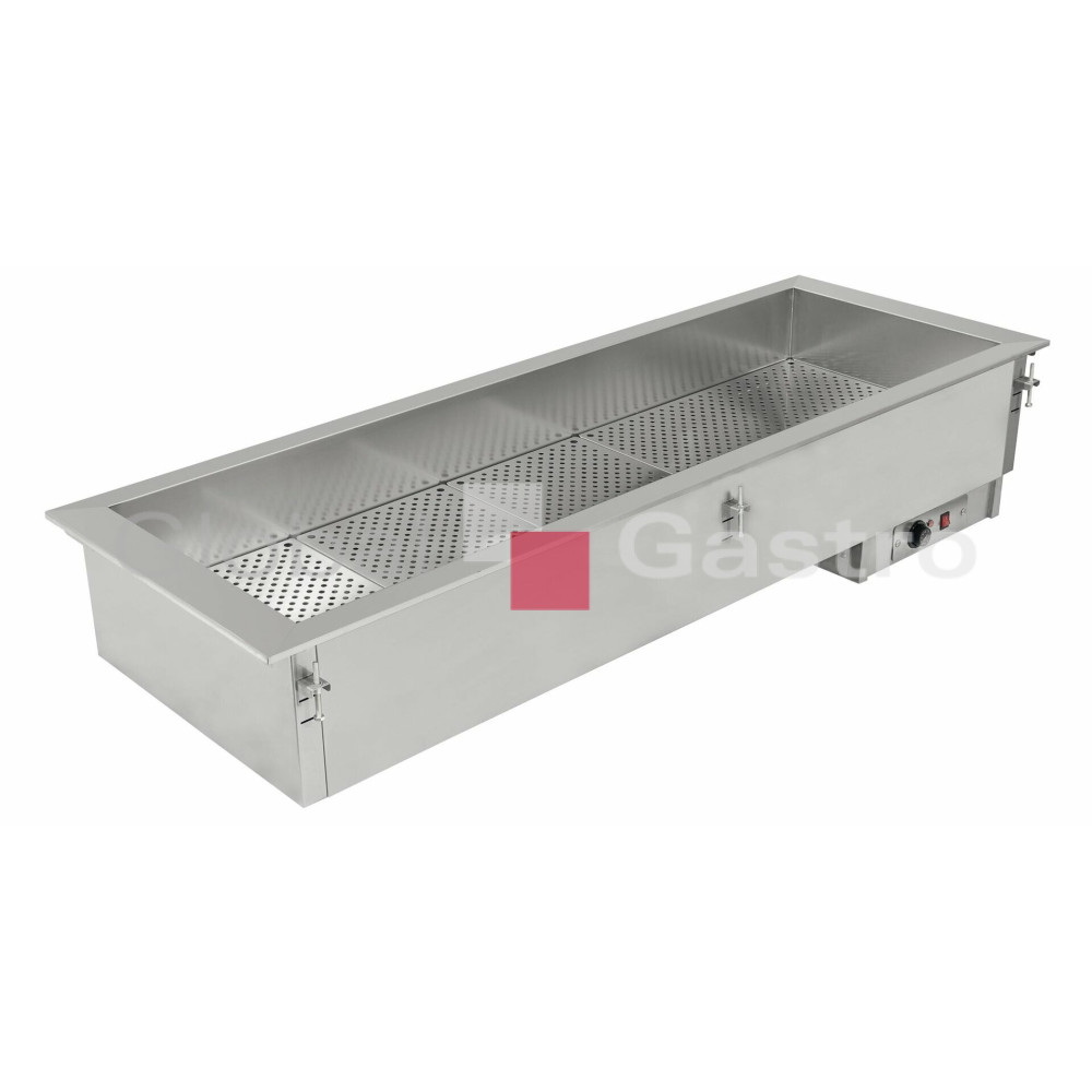 - Vestavná teplá vana (suchý statický ohřev bez vody) je speciálně navržena pro uchovávání, prezentaci a distribuci teplých potravin uložených v hlubokých nerezových GN (dodávány volitelně).