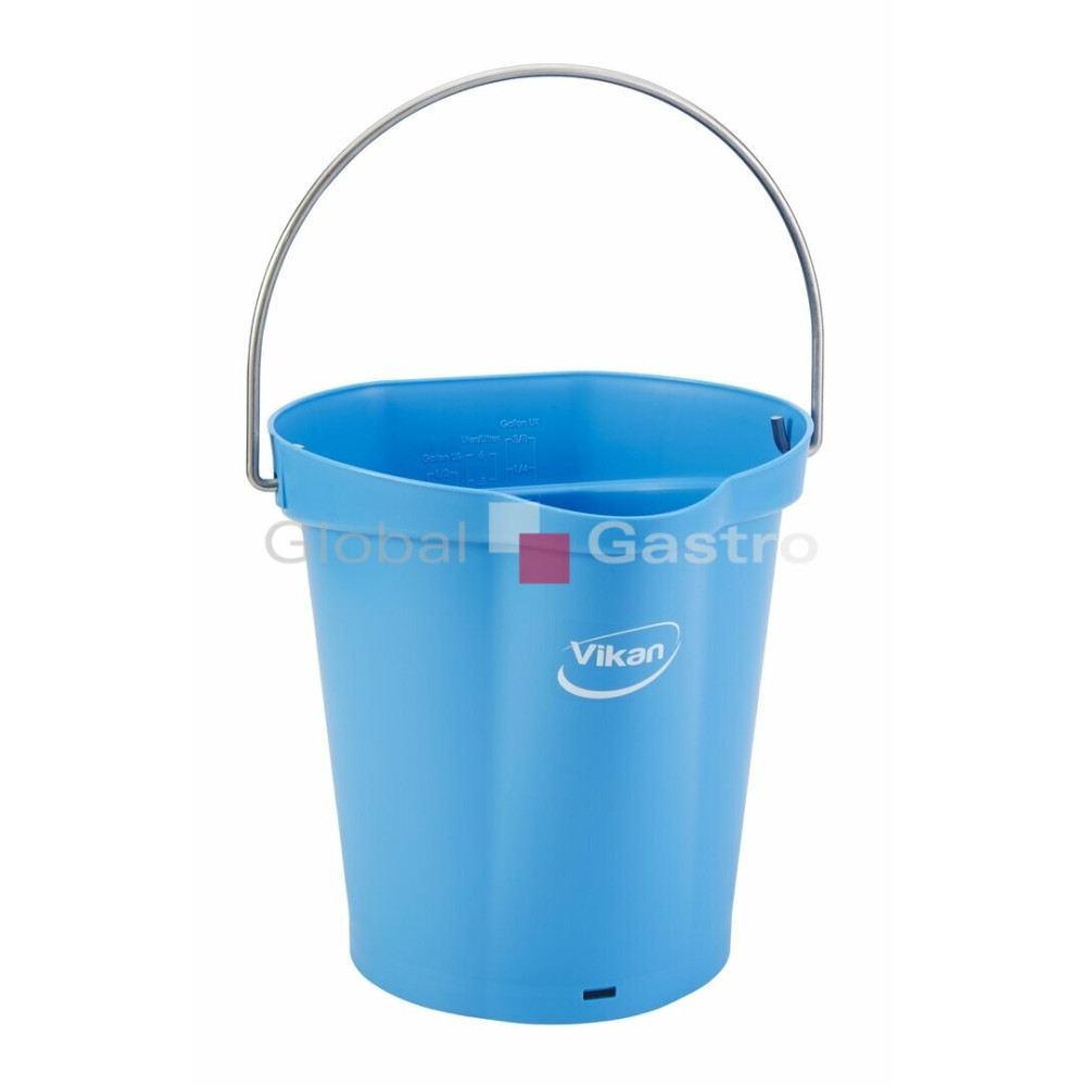 Odolné 6 litrové vědro s nerezovou rukojetí, úchytem ve dně, vnitřními kalibračními měrkami různých jednotek a výlevkou pro směrování kapaliny do jednoho proudu. Výrobek je určený pro mytí nebo skladování přísad. Zadní plocha vědra slouží pro zavěšení do nástěnného držáku Vikan 16200.