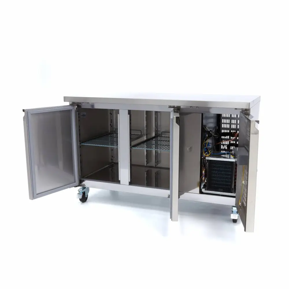 Tato prémiová pultová mraznička má luxusní design a může se pochlubit plnou kapacitou 187 l. Konstrukce je celá z nerezové oceli, včetně pracovní desky, takže je odolná a snadno se čistí. Tento spotřebič je vybaven digitálním regulátorem teploty pro snadné použití a výškově nastavitelnými policemi.