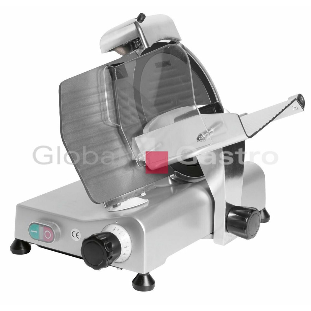 a snadné posouvání a dokrajování surovin. Nářezový stroj je vyroben z hliníkové slitiny s odolnou a hygienickou eloxovanou povrchovou úpravou (vyjma poteflonovaných částí).
