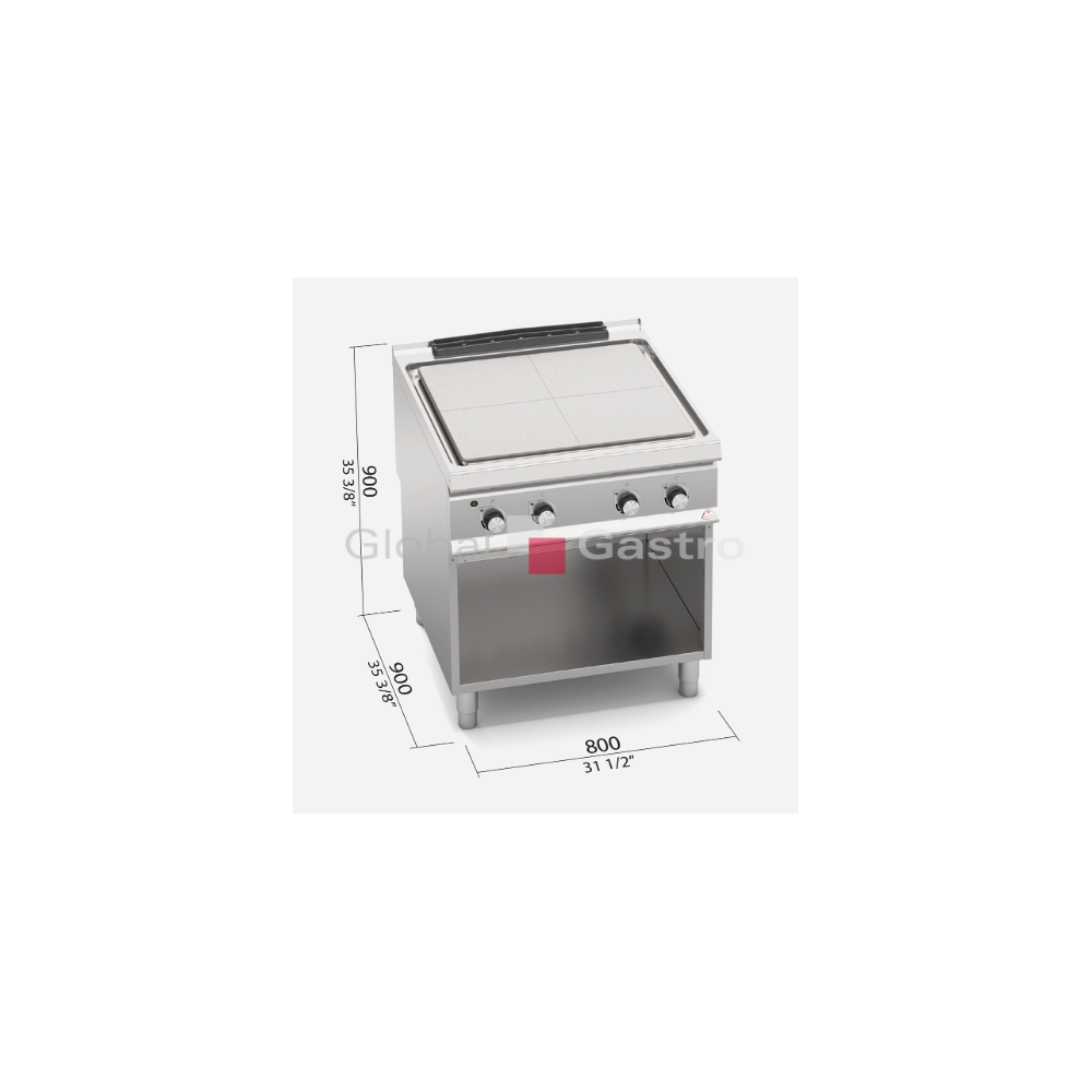 Elektrický tálový sporák (jedna velká nedělená varná plocha) s topnými tělesy o výkonu 3,5kW rovnoměrně rozloženými do čtyř zón. Plynulá regulace jednotlivých zón s kontrolkou chodu. Kompaktní provedení s otevřeným podstavcem.