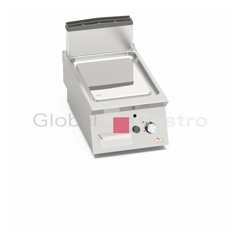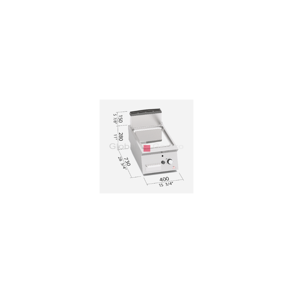 Termostatický ventil 30 až 300°C pro přesnou a bezpečnou regulaci. Termočlánek a chráněný zápalný plamínek. Dvojvrstvá grilovací plotna (umístěná v prolisované zesílené pracovní desce, tloušťka 2 mm, vybavena odtokovým otvorem) složená z ocelového plátu a horní vrstvy z nerez oceli AISI 316 s leštěným povrchem, který umožňuje snadné čištění. Nízká úroveň odlesku zvyšuje komfort při práci.