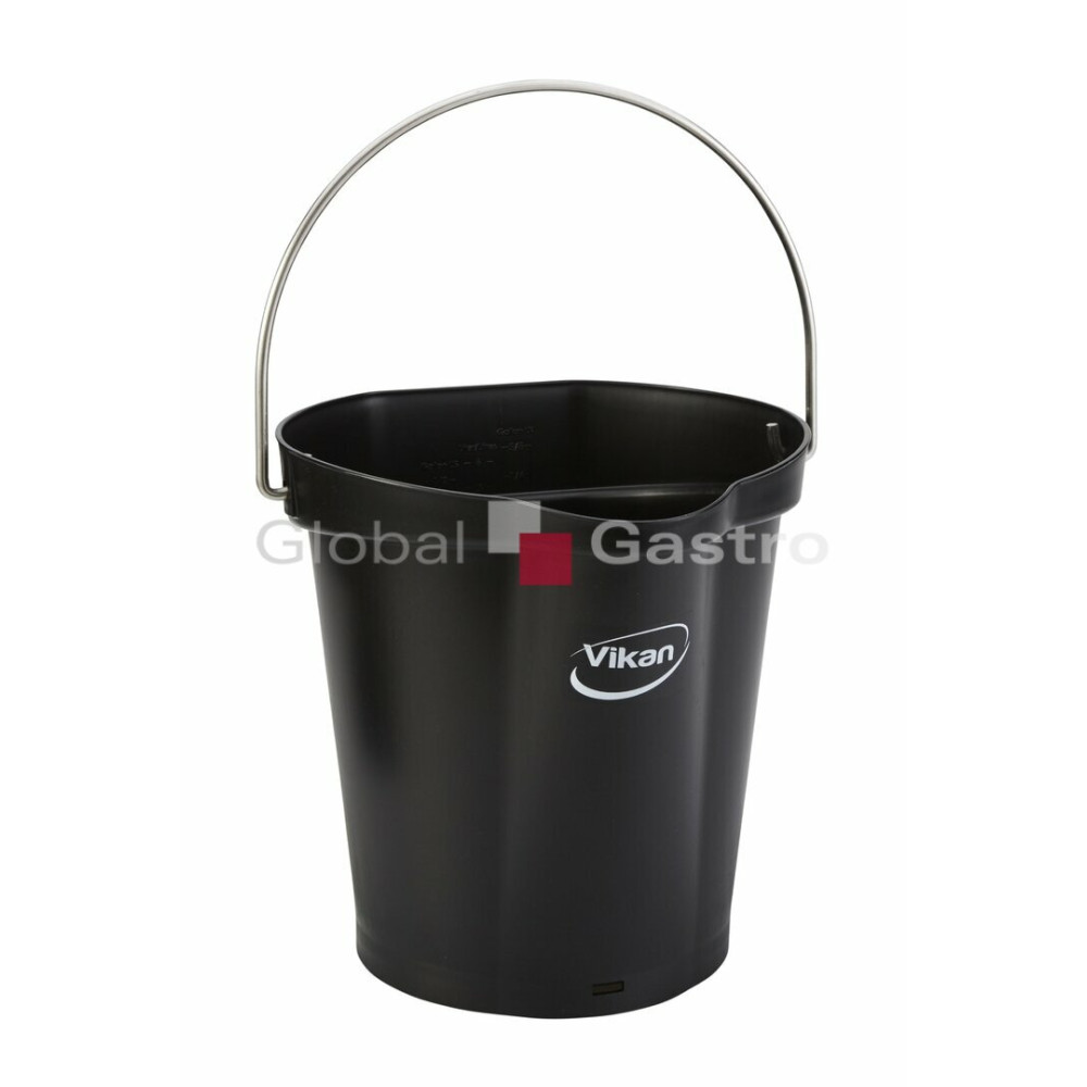 Odolné 6 litrové vědro s nerezovou rukojetí, úchytem ve dně, vnitřními kalibračními měrkami různých jednotek a výlevkou pro směrování kapaliny do jednoho proudu. Výrobek je určený pro mytí nebo skladování přísad. Zadní plocha vědra slouží pro zavěšení do nástěnného držáku Vikan 16200.