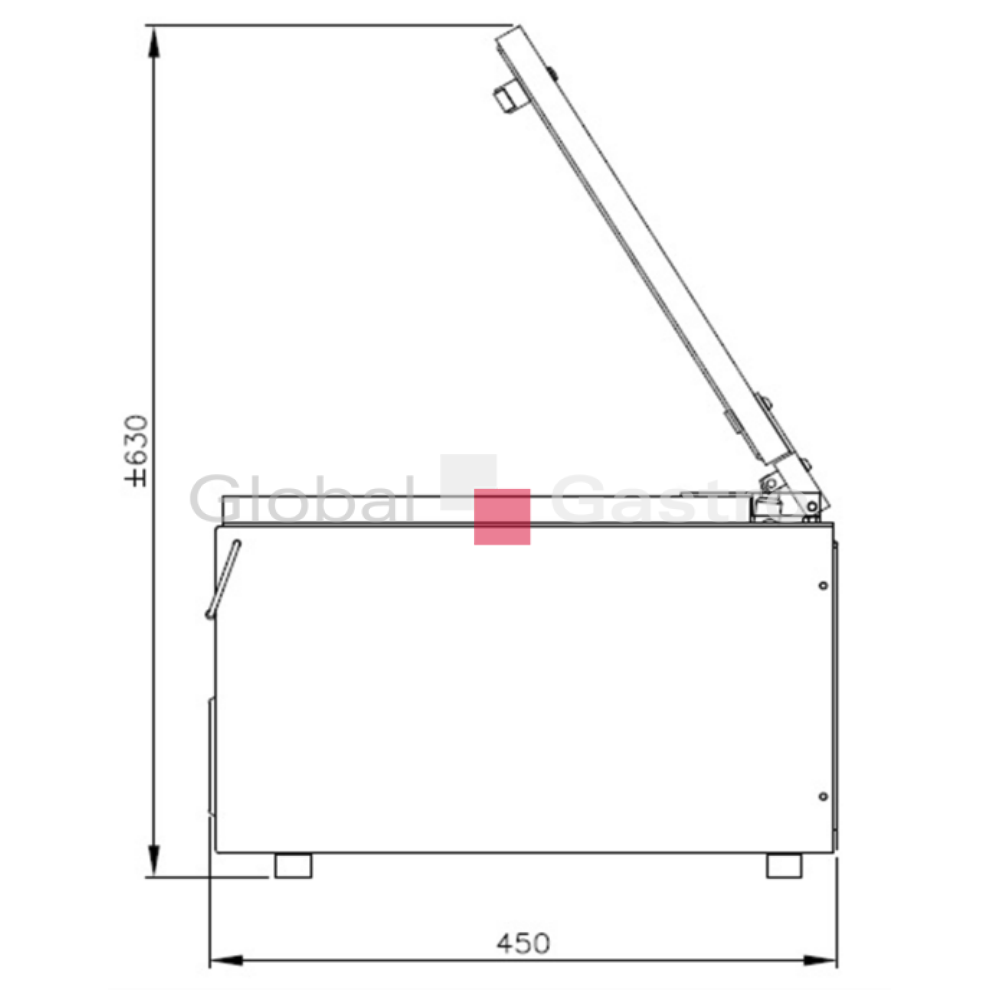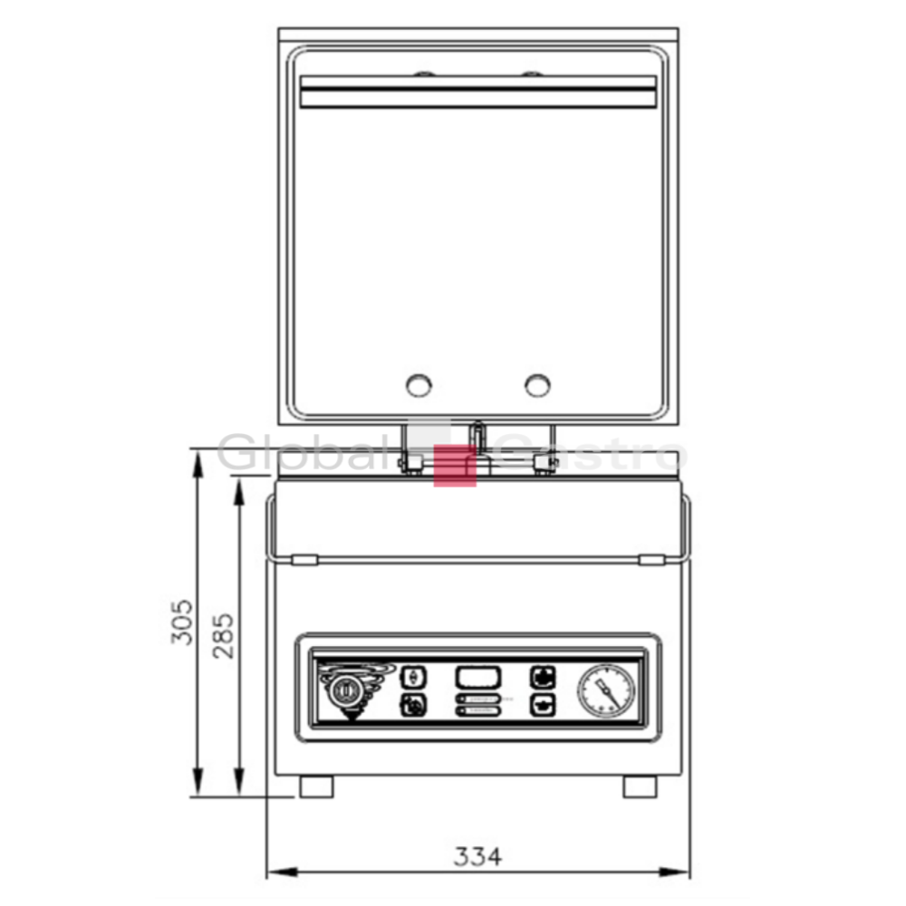 Průhledné "vypouklé" krycí víko je vyrobeno ze speciálního odolného akrylového skla a rám vnějšího víka je z ušlechtilé oceli. Opatřeno automatickým otevíráním. Pohon je zajišťován napájením o 230 V s příkonem 0,4 kW. Robustní vakuová balička je vyrobena z nerezové oceli. Ovládání senzorem vakua, snadné a přesné nastavení požadovaného vakua na digitálním ovládacím panelu s časovým řízením svařování.