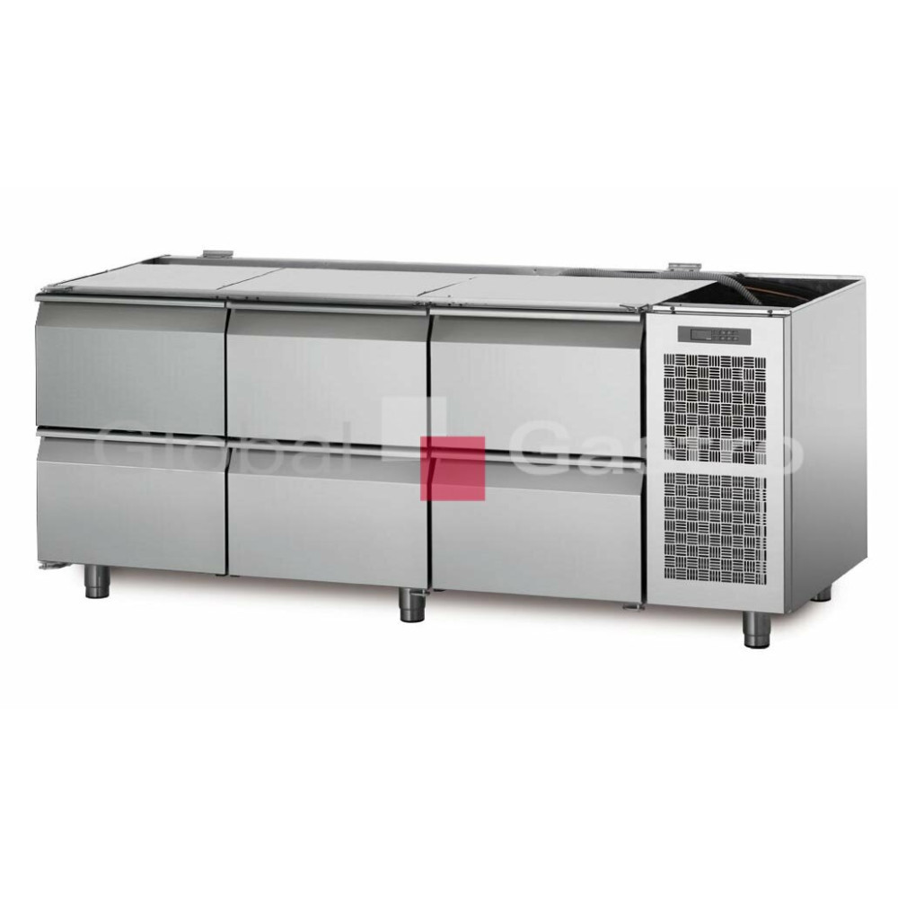 Tato prostorná chladicí pracovní deska má čistý objem 750 litrů a čtyři skleněné dveře, takže...