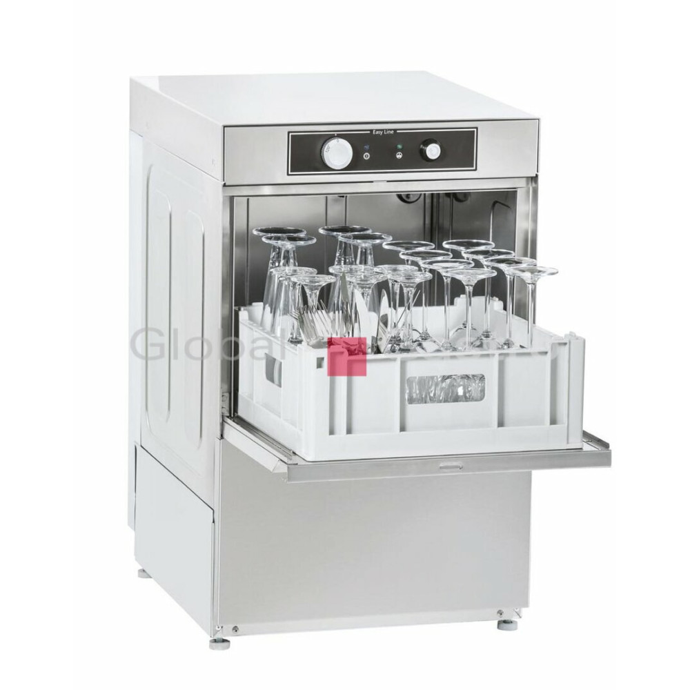 Nová jednoplášťová automatická myčka v nerezovém provedení a atraktivním designu, vybavena rotačními rameny (spodním mycím a oplachovým, horním oplachovým), snadným elektromechanickým ovládáním (otočný ovladač programu, kontrolka teploty a napájení). Mycí teplota 60°C / oplachová teplota 85°C, minimalizace ztrát tlaku vody díky výkonnému mycímu čerpadlu (300W). Dvouplášťová dvířka komory s mikrospínačem, vybavena dávkovačem oplachového prostředku, dávkovačem mycího prostředku (DD) a vestavěným odpadovým čerpadlem (B).