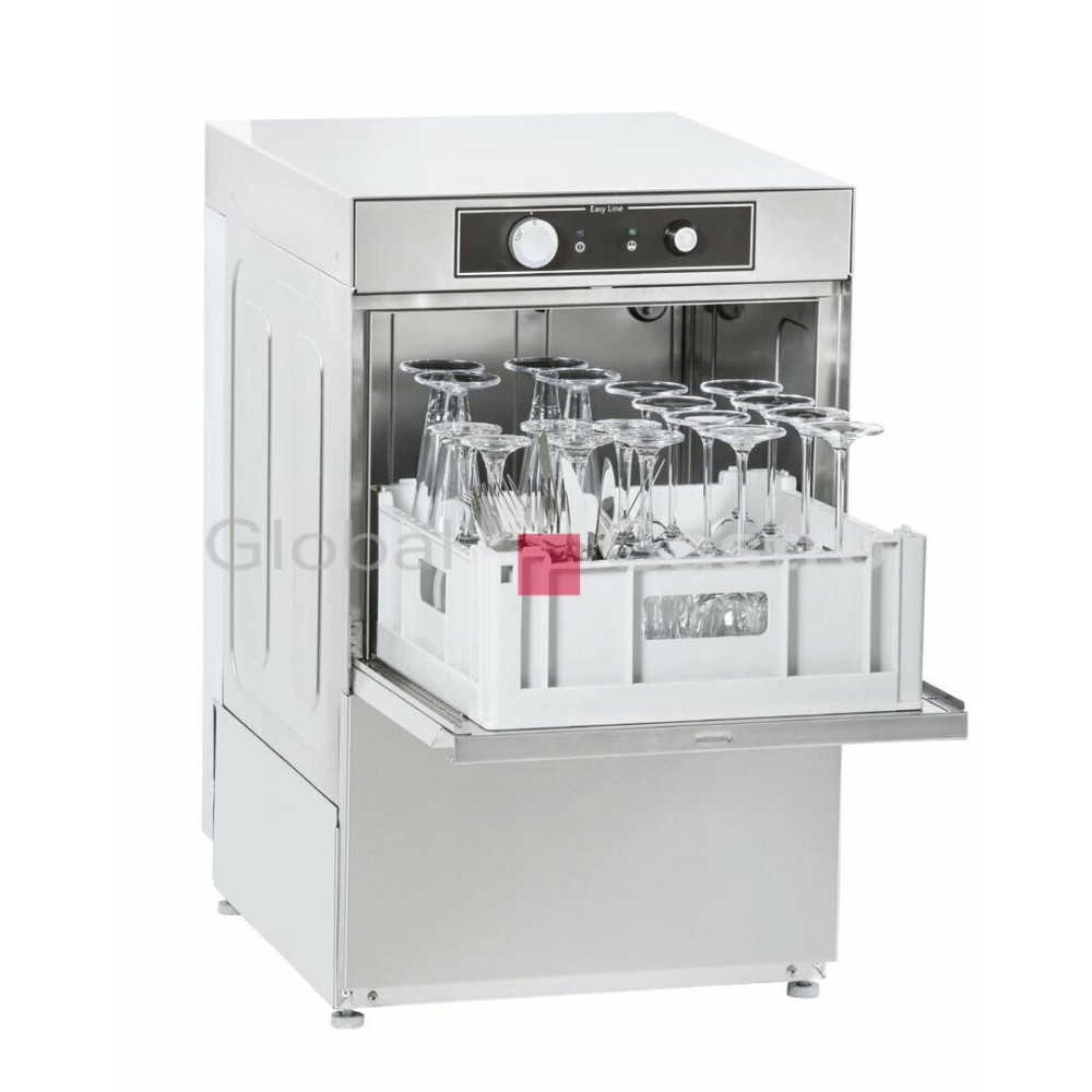 Nová jednoplášťová automatická myčka v nerezovém provedení a atraktivním designu, vybavena rotačními rameny (spodním mycím a oplachovým, horním oplachovým), snadným elektromechanickým ovládáním (otočný ovladač programu, kontrolka teploty a napájení). Mycí teplota 60°C / oplachová teplota 85°C, minimalizace ztrát tlaku vody díky výkonnému mycímu čerpadlu (300W). Dvouplášťová dvířka komory s mikrospínačem, vybavena dávkovačem oplachového prostředku, dávkovačem mycího prostředku (DD) a odpadovým čerpadlem (B).