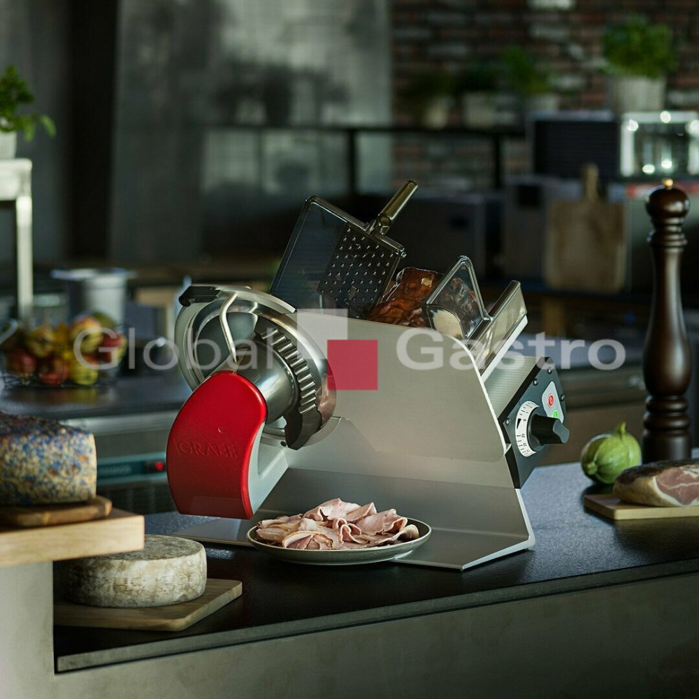 Nářezový stroj manuální pro profesionální použití na porcování a krájení různých produkt (uzeniny, maso, sýr, chléb, zeleninu a ovoce). Vhodný pro gastronomické provozy a menší prodejny. Opravdový multitalent se šírokým spektrem využití. Promyšlená konstrukce stroje zabezpečí nejlepší výsledky krájení, optimální přístup a komfort při čistění. Vysoký hygienický standard. Účinný systém chlazení motoru a hybridní pohon (šneková převodovka pohánějící klínový řemen) umožňuje efektivní a bezúdržbový přenos energie i při nepřetržitém provozu. Důmyslný "L" design umožňuje šikovnou kombinaci a těsné seskupení s úložnými tácky, krájecími deskami, nebo s váhou atd. Maximální řezná kapacita s minimální stopou, přesné a praktické nastavení tloušťky řezu od 0 až do 20mm. Vertikální provedení nářezového stroje, barva odolných plastů : černá (standardní), na objednávku v barvě (červená,bílá)