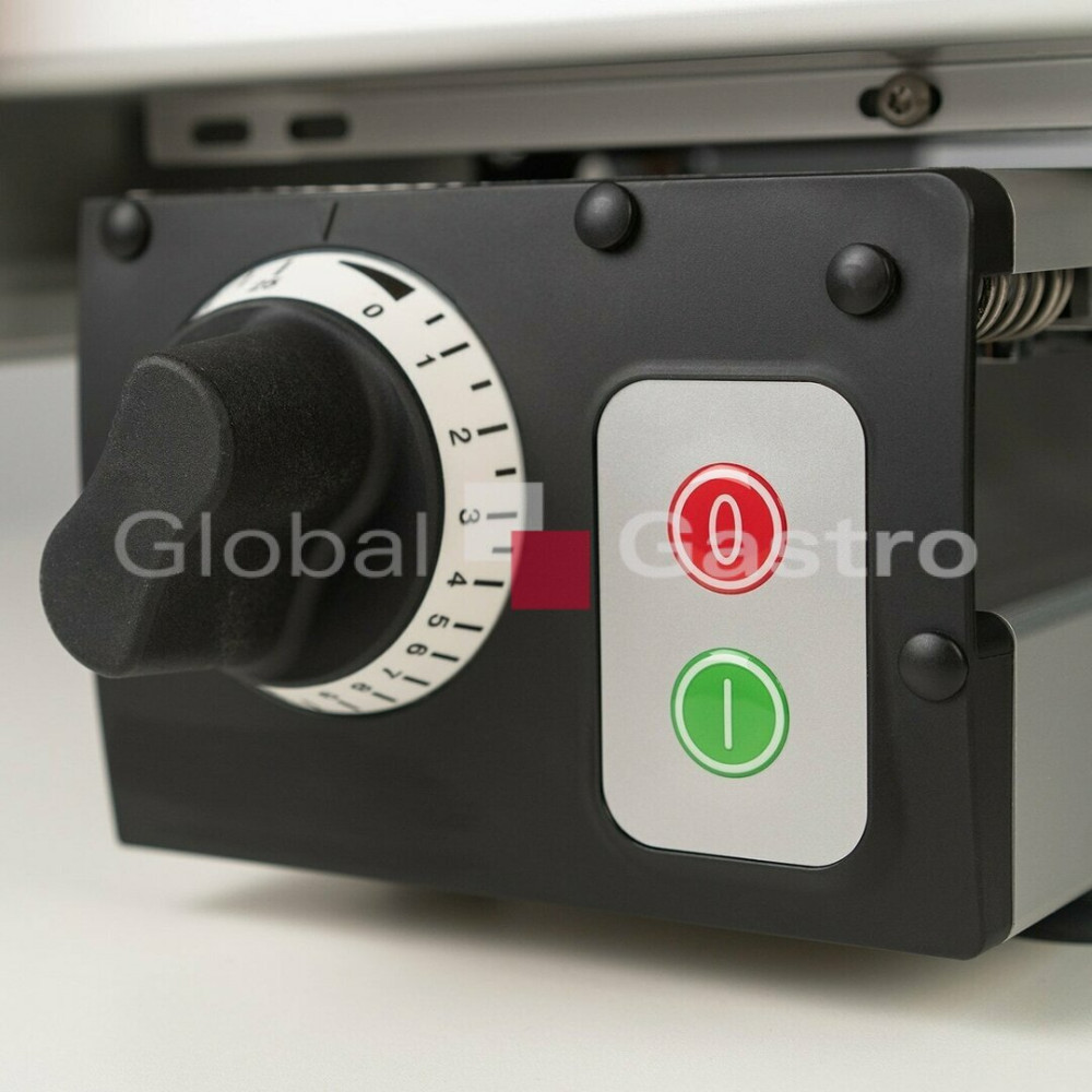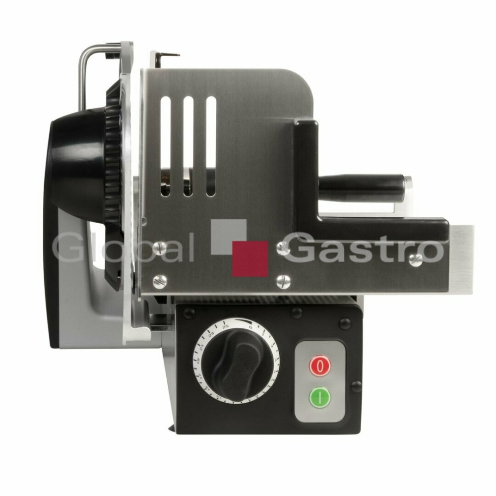 Nářezový stroj manuální pro profesionální použití na porcování a krájení různých produkt (uzeniny, maso, sýr, chléb, zeleninu a ovoce). Vhodný pro gastronomické provozy a menší prodejny. Opravdový multitalent se šírokým spektrem využití. Promyšlená konstrukce stroje zabezpečí nejlepší výsledky krájení, optimální přístup a komfort při čistění. Vysoký hygienický standard. Účinný systém chlazení motoru a hybridní pohon (šneková převodovka pohánějící klínový řemen) umožňuje efektivní a bezúdržbový přenos energie i při nepřetržitém provozu. Důmyslný "L" design umožňuje šikovnou kombinaci a těsné seskupení s úložnými tácky, krájecími deskami, nebo s váhou atd. Maximální řezná kapacita s minimální stopou, přesné a praktické nastavení tloušťky řezu od 0 až do 20mm. Vertikální provedení nářezového stroje, barva odolných plastů : černá (standardní), na objednávku v barvě (červená,bílá)
