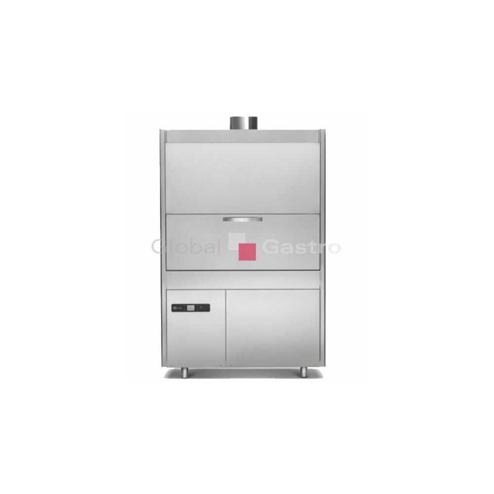 Automatická dvouplášťová myčka kuchyňského (černého) nádobí VS P109-86N-DB s čelním plněním v celonerezovém provedení. Speciální konstrukce mycích ramen proti zanášení (snadno demontovatelná pro čištění) doplněny o dvě postranní vertikální statická ramena výrazně zvyšující účinek mytí i bočního. Lisovaná vana s dvojitými filtry a oblými rohy pro hygienu a snadnou údržbu. Dvouplášťové provedení výrazně snižuje hladinu hluku a tepelné ztráty (náklady na energie, lepší pracovní prostředí). Velký nerezový zakládací koš (615 x 1150 mm) a úložná výška až 860 mm (využitelná výška 835mm) umožňuje mýt podnosy, gastronádoby, pekařské plechy, přepravky (800x600 a 600x400 mm). Vysoce účinné mycí čerpadlo zajišťuje dostatečný výkon pro 4 mycí a 4 oplachová rotační nerezová ramena. Bezproblémový chod stroje zaručuje snadné elektronické ovládání s LCD displejem EVO2 s funkcí automatického startu při uzavření zákrytu. Čtyři přednastavené mycí cykly pro různé typy nádobí. Dvě úrovně menu: ovládací a technické (chráněné kódem PIN - servis). Počítadlo denního a celkového počtu cyklů.