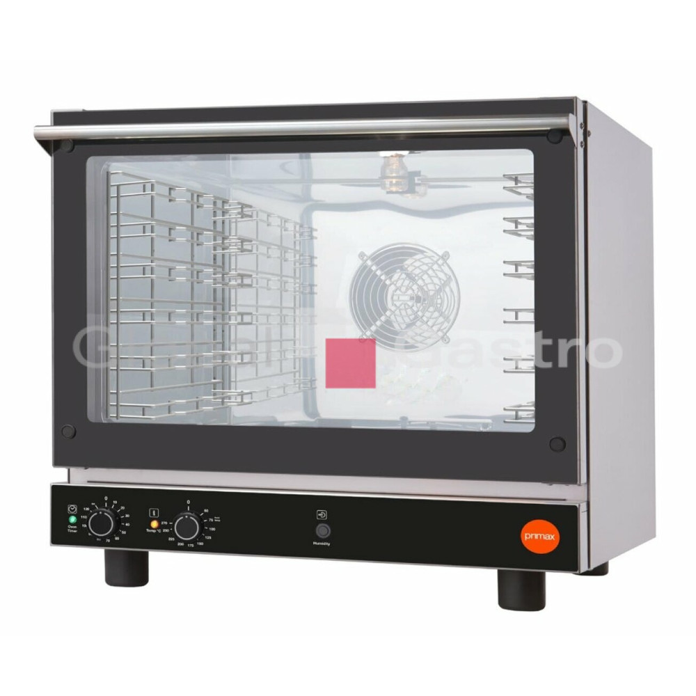 Pekařské a cukrářské pece předního Italského výrobce firmy Primax jsou vyrobeny v Itálii z evropských komponentů a kvalitní nerezových materiálů, sestaveny pod přísnou kontrolou v moderním funkčním designu. Pece FAST jsou ideálním řešením pro lehčí provozy k přípravě čerstvého, nebo zmraženého pečiva a dalších produktů. Pece jsou ideální pro kavárny, bary, rychlá občerstvení, čerpací stanice, plovárny. Celonerezové provedení AISI 430 (304), izolovaná komora (keramická vlákna), varný prostor se zaoblenými hranami a lisovaným dnem. Snadné manuální ovládání s nastavení teploty 50°- 270°C, nastavením času 0 - 120 min. a trvalý chod (nekonečno). Model je v provedení se snadným manuálním nástřikem (přivlhčením) do komory, ovládán tlačítkem nástřiku. Optimální prodění vzduchu zajišťuje výkonný ventilátor (240W) a nerezová topná tělesa Incoloy 800 (5,5kW). Komora je vybavena vnitřním osvětlením a snadno vyjímatelným odolným těsněním. Odvětrávaná výklopná dvířka s dvojitým sklem a nerezovým bezpečné umístěným madlem. Nerez vyjímatelné zásuvy s roztečí 70 mm.