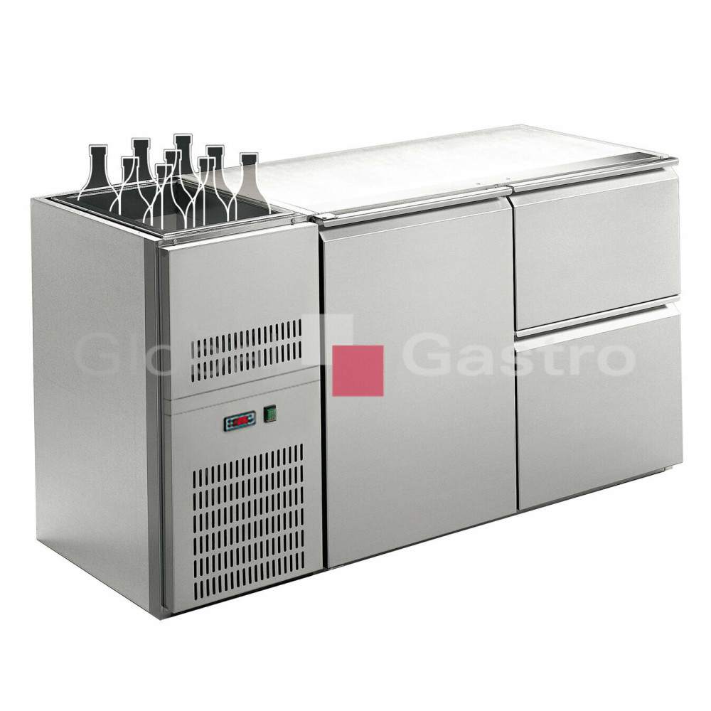Dvousekcový barový chladící stůl. Model v celonerezovém provedení (AISI 304), s chlazenou vanou (312x515xh250) nad agregátem (vpravo/vlevo). Digitální ovládání, ventilované chlazení, aut.odtávání (připojení na odpad). Stoly ve standardu dodávány bez vrchní pracovní desky (viz.příslušenství). Umístění agregátu standardně vpravo (REGD) na objednávku možno umístit agregát vlevo (model REGS). Modely je možno dodat v provedení s dvouokruhovým systémem chlazení (samostatné nastavení teploty vany a spodního chladícího prostoru (dveře/zásuvky), případně ve výbavě LUXUS (masivní panty a zámky dveří/zásuvek). Provedení REG(S) = agregát vlevo ze (strany obsluhy) Provedení REG(D) = agregát vpravo ze (strany obsluhy)