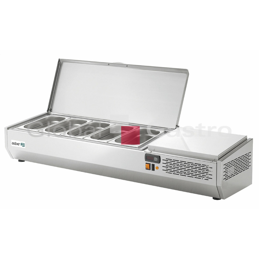 Chladící pizza nástavba ASBER GVL (dříve EVL) v celonerezovém provedení s vrchním nerezovým krycím víkem (sklopným s fixací v otevřeném stavu) určena nejenom pro pizza chladící stoly ASBER. Speciálně vyrobena z vysoce kvalitní nerezové oceli pro náročné profesionální provozy, vyznačující se velmi robustním designem a dokonalým zpracováním, odtok vody speciálně navržený pro snadné čistění. Vitríny se statickým chlazením a vestavěnou jednotkou jsou určeny pro uchovávání chlazených ingrediencí pro přípravu pizzy, salátů, sendvičů a dalších pokrmů v nerezových GN nádobách (velikost dle modelu GN1/4, nebo GN1/3) s hloubkou maximálně 150mm. Intuitivní digitální ovládání (snadné nastavení teploty a parametrů), teplotní rozsah od +2°C do +8°C, klimatická třída IV, světelné tlačítko start-stop, ekologický chladicí plyn: R600 Hydrofluorouhlík (HC), napájecí napětí: 230V1N/50 Hz.