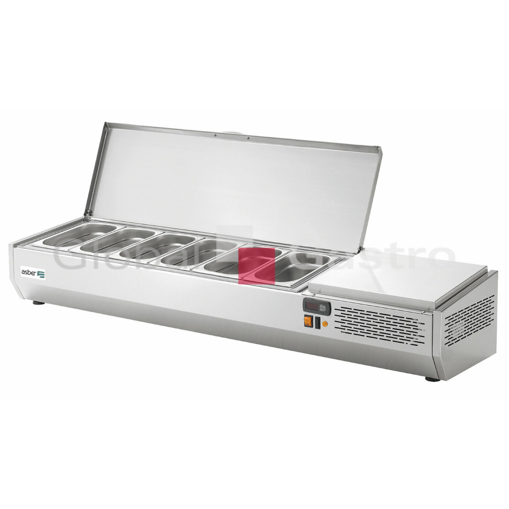 Chladící pizza nástavba ASBER GVL (dříve EVL) v celonerezovém provedení s vrchním nerezovým krycím víkem (sklopným s fixací v otevřeném stavu) určena nejenom pro pizza chladící stoly ASBER. Speciálně vyrobena z vysoce kvalitní nerezové oceli pro náročné profesionální provozy, vyznačující se velmi robustním designem a dokonalým zpracováním, odtok vody speciálně navržený pro snadné čistění. Vitríny se statickým chlazením a vestavěnou jednotkou jsou určeny pro uchovávání chlazených ingrediencí pro přípravu pizzy, salátů, sendvičů a dalších pokrmů v nerezových GN nádobách (velikost dle modelu GN1/4, nebo GN1/3) s hloubkou maximálně 150mm. Intuitivní digitální ovládání (snadné nastavení teploty a parametrů), teplotní rozsah od +2°C do +8°C, klimatická třída IV, světelné tlačítko start-stop, ekologický chladicí plyn: R600 Hydrofluorouhlík (HC), napájecí napětí: 230V1N/50 Hz.