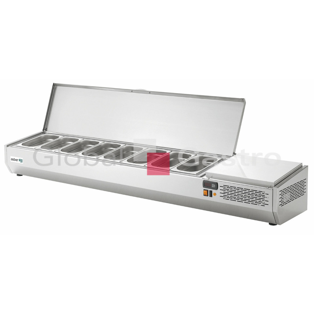 Chladící pizza nástavba ASBER GVL (dříve EVL) v celonerezovém provedení s vrchním nerezovým krycím víkem (sklopným s fixací v otevřeném stavu) určena nejenom pro pizza chladící stoly ASBER. Speciálně vyrobena z vysoce kvalitní nerezové oceli pro náročné profesionální provozy, vyznačující se velmi robustním designem a dokonalým zpracováním, odtok vody speciálně navržený pro snadné čistění. Vitríny se statickým chlazením a vestavěnou jednotkou jsou určeny pro uchovávání chlazených ingrediencí pro přípravu pizzy, salátů, sendvičů a dalších pokrmů v nerezových GN nádobách (velikost dle modelu GN1/4, nebo GN1/3) s hloubkou maximálně 150mm. Intuitivní digitální ovládání (snadné nastavení teploty a parametrů), teplotní rozsah od +2°C do +8°C, klimatická třída IV, světelné tlačítko start-stop, ekologický chladicí plyn: R600 Hydrofluorouhlík (HC), napájecí napětí: 230V1N/50 Hz.