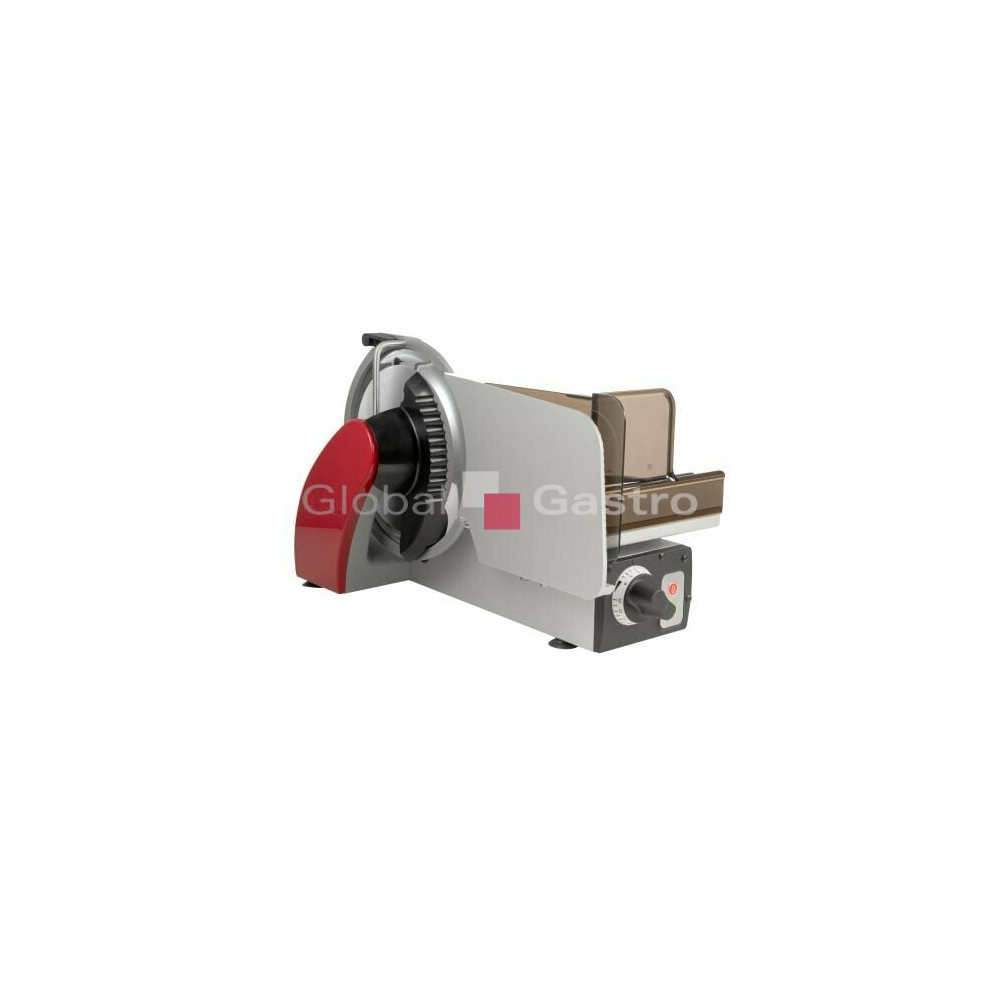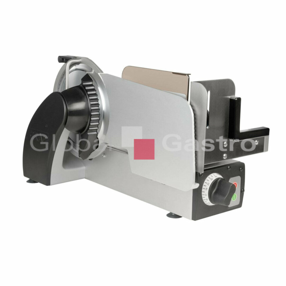 Nářezový stroj manuální pro profesionální použití na porcování a krájení různých produkt (uzeniny, maso, sýr, chléb, zeleninu a ovoce). Vhodný pro gastronomické provozy a menší prodejny. Opravdový multitalent se šírokým spektrem využití. Promyšlená konstrukce stroje zabezpečí nejlepší výsledky krájení, optimální přístup a komfort při čistění. Vysoký hygienický standard. Účinný systém chlazení motoru a hybridní pohon (šneková převodovka pohánějící klínový řemen) umožňuje efektivní a bezúdržbový přenos energie i při nepřetržitém provozu. Důmyslný "L" design umožňuje šikovnou kombinaci a těsné seskupení s úložnými tácky, krájecími deskami, nebo s váhou atd. Maximální řezná kapacita s minimální stopou, přesné a praktické nastavení tloušťky řezu od 0 až do 20mm. Vertikální provedení nářezového stroje, barva odolných plastů : černá (standardní), na objednávku v barvě (červená,bílá)