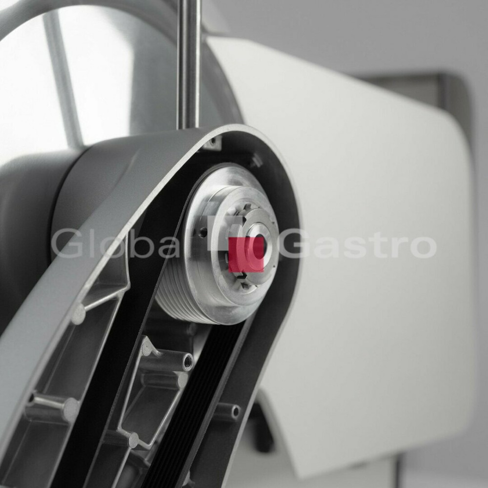 Pohon nářezového stroje zajišťuje výkonný 300 W motor (tichý, účinný, dobře chlazený hybridní pohon (šneková převodovka pohánějící klínový řemen) umožňuje efektivní a bezúdržbový přenos energie i při nepřetržitém provozu)