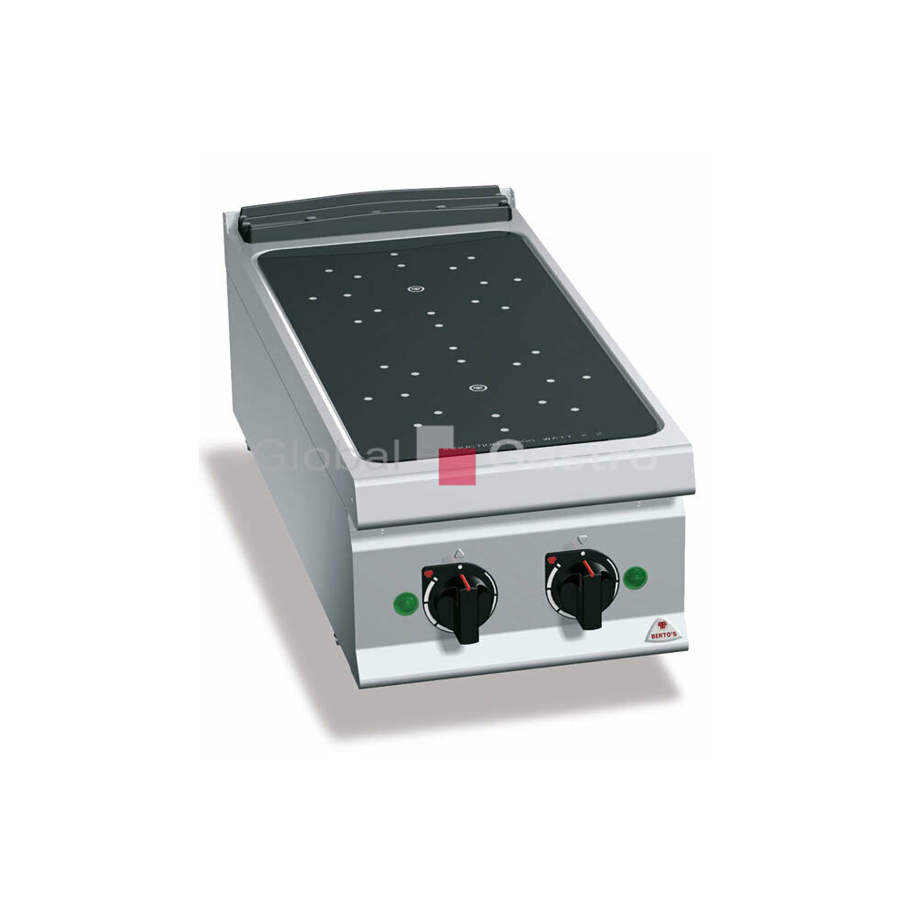 Indukční keramická varná deska, tloušťka 6 mm (snadná každodenní údržba bez použití abrasivních prostředků). Maximální úspora energie, vytápění jednotlivých varných ploch (270x270 mm) je pouze při kontaktu hrnce s varnou plochou. Velikost topných zón je samo-regulovana podle průměru nádobí. Při odstranění nádobí z povrchu je automaticky přerušeno vytápění. Elektronická regulace teploty potenciometrem. Model TOUCH s dotykovým elektronickým ovládáním.