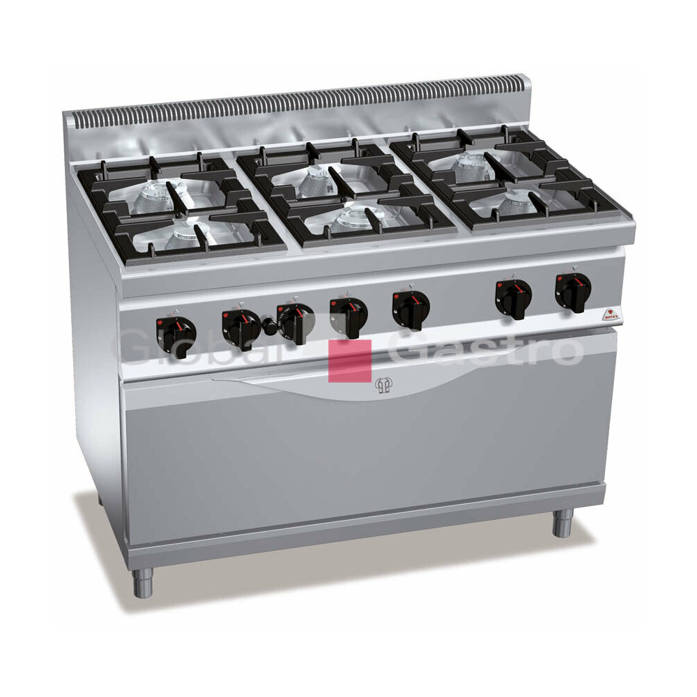 Příprava jídel přímo na plameni je u všech kuchařů nezbytná pro zdůraznění tradičních kulinářských dovedností. Tvar litinových roštů tvoří optimální pracovní plochu pro snadnou manipulaci s nádobím. Silné litinové hořáky 7 kW zaručují nadstandardní výkon a životnost. Vysoká energetická účinnost plynových hořáků umožňuje uspořit nejméně 30% plynu ročně v porovnání s tradičními hořáky. Odkapové vaničky pod hořáky mají zaoblené hrany, jsou kompletně odnímatelné. Vše je navrženo tak, aby byla snadná údržba a čištění. Pracovní plocha a opláštění z nerez oceli AISI 304. Výkonné litinové hořáky HIGH POWER, snadno demontovatelné a umístěné ve vyjímatelných prolisovaných smaltovaných (nerezových) odkapových vanách. Zapalování hořáků věčným plamínkem. Plynové trouby, pro 4 plechy 1045x530mm ,vybaveny piezoelektrickým zapalováním a ovládány inovovanými ovladači s dvojitou konstrukcí prodlužující životnost.