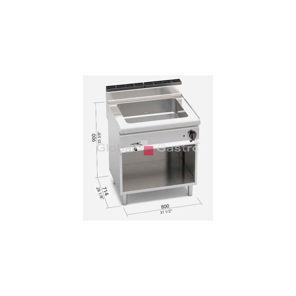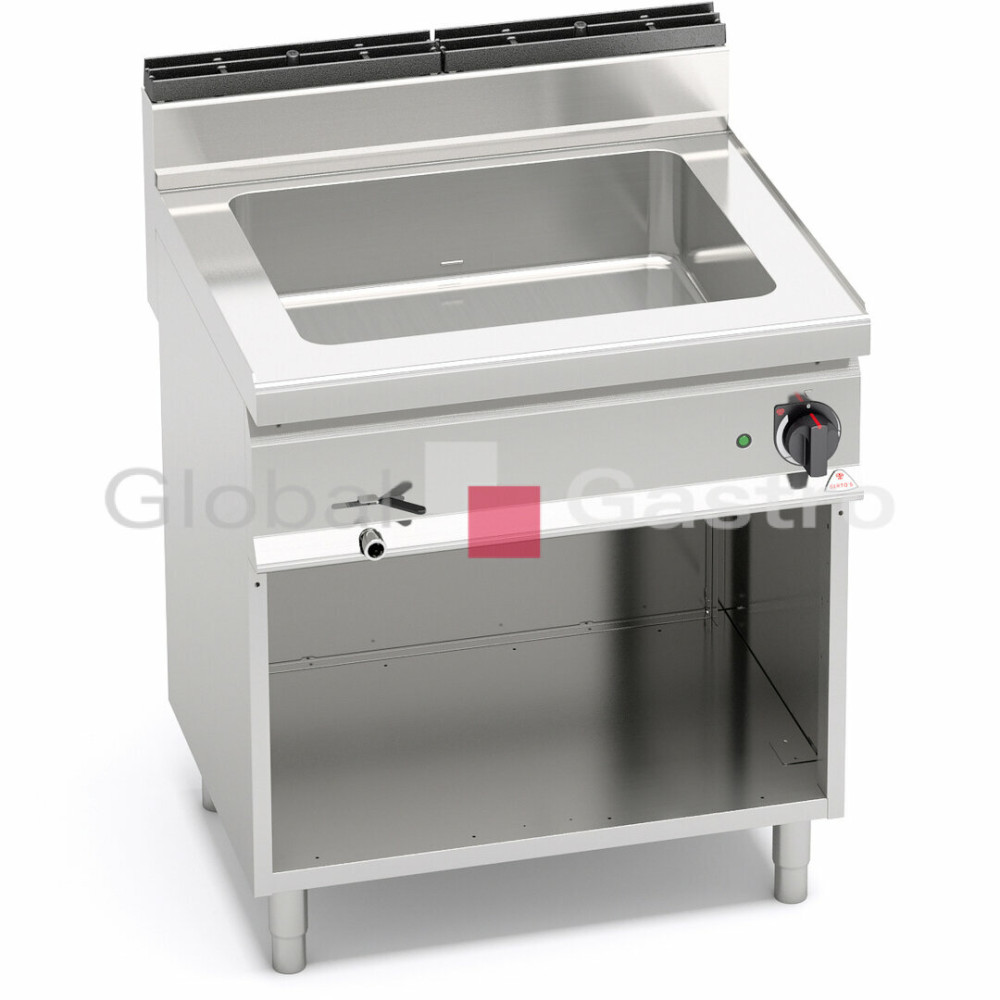 Nerezová vana pro GN s hloubkou 150 mm. Vypouštění kulovým kohoutem s tepelně odolným držadlem. Elektronická regulace výkonu. Kompaktní provedení s otevřeným podstavcem. Cena uvedena bez GN. Plynové a elektrické vodní lázně jsou ideálním řešením k šetrnému udržování pokrmů v teplém stavu.Potraviny jsou uchovávány ve vyhřívaných gastronádobách. Snadná a přesná regulace teploty zaručuje úsporu energie. Lisovaná vana se zaoblenými hranami umožňuje snadné čištění a údržbu.