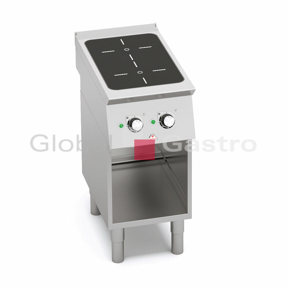 Keramická varná deska, tloušťka 6 mm (snadná každodenní údržba bez použití agrasivních prostředků). Maximální úspora energie, vytápění varné plochy je pouze při kontaktu hrnce s varnou plochou. Velikost topných zón je samo-regulovana podle průměru nádobí. Při odstranění nádobí z povrchu je automaticky přerušeno vytápění. Elektronická regulace teploty je prováděna potenciometrem. Kompaktní provedení s otevřeným podstavcem. Model TOUCH s dotykovým elektronickým ovládáním. Pracovní deska z kvalitní nerez oceli AISI 304 tloušťka 2 mm (20/1), přední a boční opláštění z nerezové oceli AISI 304. Termostatický ventil 30 až 300°C pro přesnou a bezpečnou regulaci. Termočlánek a chráněný zápalný plamínek. Dvojvrstvá grilovací plotna (umístěná v prolisované zesílené pracovní desce, tloušťka 2 mm, vybavena odtokovým otvorem) složená z ocelového plátu a horní vrstvy z nerez oceli AISI 316 s leštěným povrchem, který umožňuje snadné čištění. Nízká úroveň odlesku zvyšuje komfort při práci.