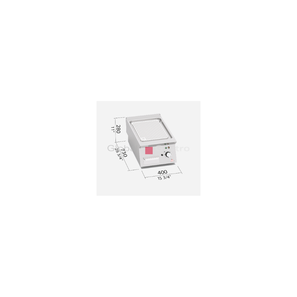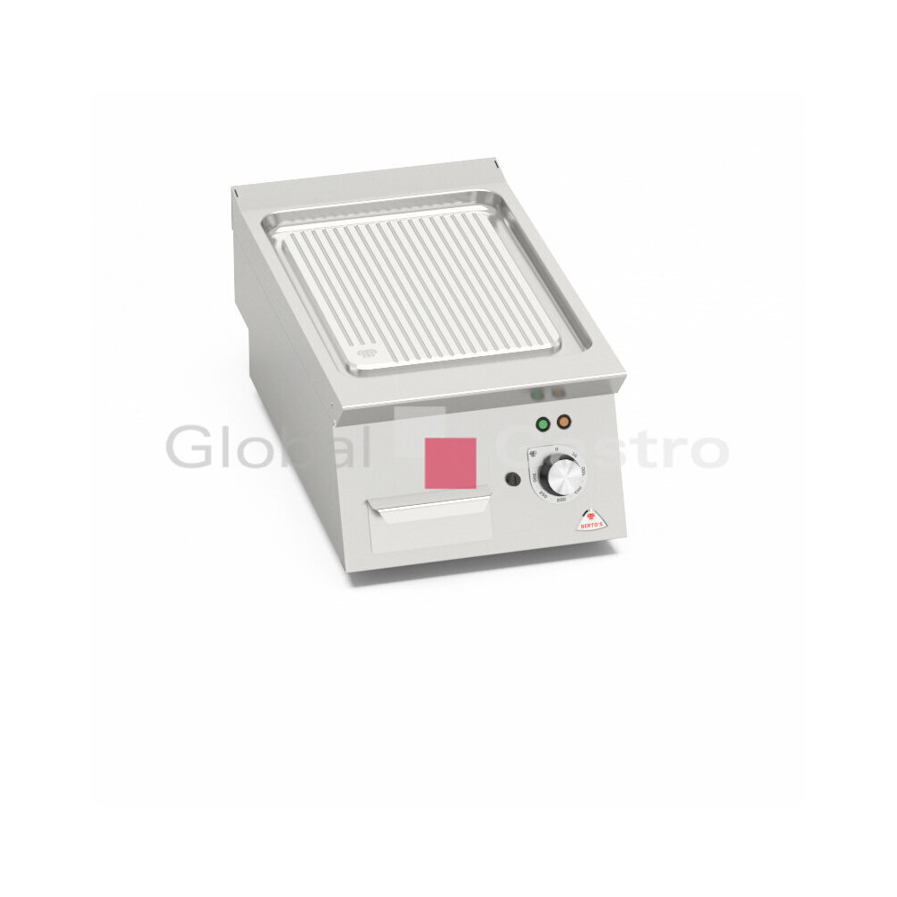 Výkonné elektrické topné těleso s regulací výkonu. Nádrž na vodu pod varnou zónou, se zaoblenými hranami a výpustným otvorem. Univerzální grilovací litinový rošt s postraními lemy. Pracovní deska z kvalitní nerez oceli AISI 304 tloušťka 2 mm (20/1), přední a boční opláštění z nerezové oceli AISI 304. Dvojvrstvá grilovací plotna (umístěná v prolisované zesílené pracovní desce, tloušťka 2 mm, vybavena odtokovým otvorem) složená z ocelového plátu a horní vrstvy z nerez oceli AISI 316 s leštěným povrchem, který umožňuje snadné čištění. Nízká úroveň odlesku zvyšuje komfort při práci.