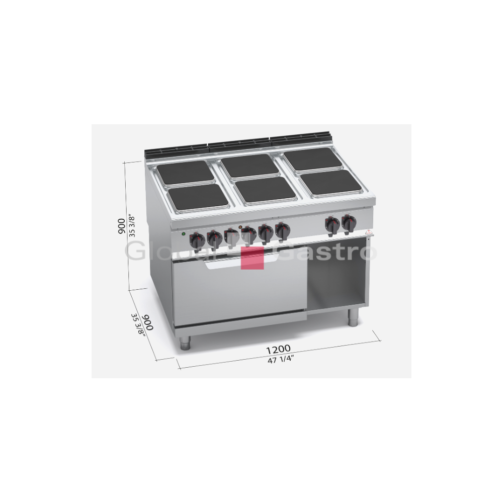 Pracovní plocha a opláštění z nerez oceli AISI 304. Litinová varné plotýnky s bezpečnostním termostatem a regulací výkonu. Kompaktní provedení s el.statickou multifunkční troubou GN 2/1. Sporák je vybaven čtyřmi varnými plotýnkami z litiny s plochou 300x300 mm. Každá plotýnka má výkon 3,5 kW a dosáhne teploty 400 °C. Pracovní plochu lze doplnit o ocelovou výplň prostoru mezi plotnami, čímž se dosáhne celistvé pracovní plochý. Teplota je regulována nezávisle nastavitelnými spínači. Přímá kontrola teploty umožňuje významně uspořit energie. Topná tělesa jsou hermeticky uzavřena v jednom celku, který je lisovánv rovině do varné desky. Konvekční trouba vhodná pro GN 1/1, nebo model se statickou multifunkční troubou pro GN 2/1. Trouby mají nově zesílené litinové dno a jsou vybaveny kvalitním těsněním dveří.