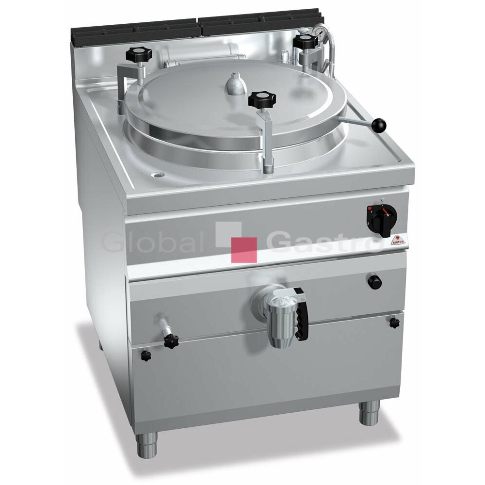 Tlakové víko s pojistným ventilem a pevnou kalibrací 0,05 bar, zajišťováno ručně stavitelnými šrouby. Nepřímý ohřev s nízkotlakou párou (0,5 bar) generovanou v meziplášti trubkovým hořákem z nerezové oceli s optimalizovaným spalováním, bezpečnostním ventilem, termočlánkem a chráněným zápalným plamínkem. Piezoelektrické zapalování s gumovou ochranou. Regulace teploty ventilem s horní a dolní pozicí. Varné kotle jsou dodávány ve verzi s přímým ohřevem (pouze plynové modely) pro vaření tekutých potravin,které nepotřebují stálé míchání a dále modely s šetrným nepřímým ohřevem(plynové i elektrické) určené pro tepelnou přípravu (např. krémya omáčky). Nádoba z oceli AISI 316 je vysoce odolná vůči agresivnímu prostředí. Do kotlů mohou být použity perforované koše pro vařenívětšího množství zeleniny. Snadná údržba a čistění díky zaobleným hranám a vypouštěcímu kohoutu, kterým jsou nečistoty odstraněny.Dvouplášťové kotle mohou být vybaveny automatickým dopouštěním vody do pláště kotle.