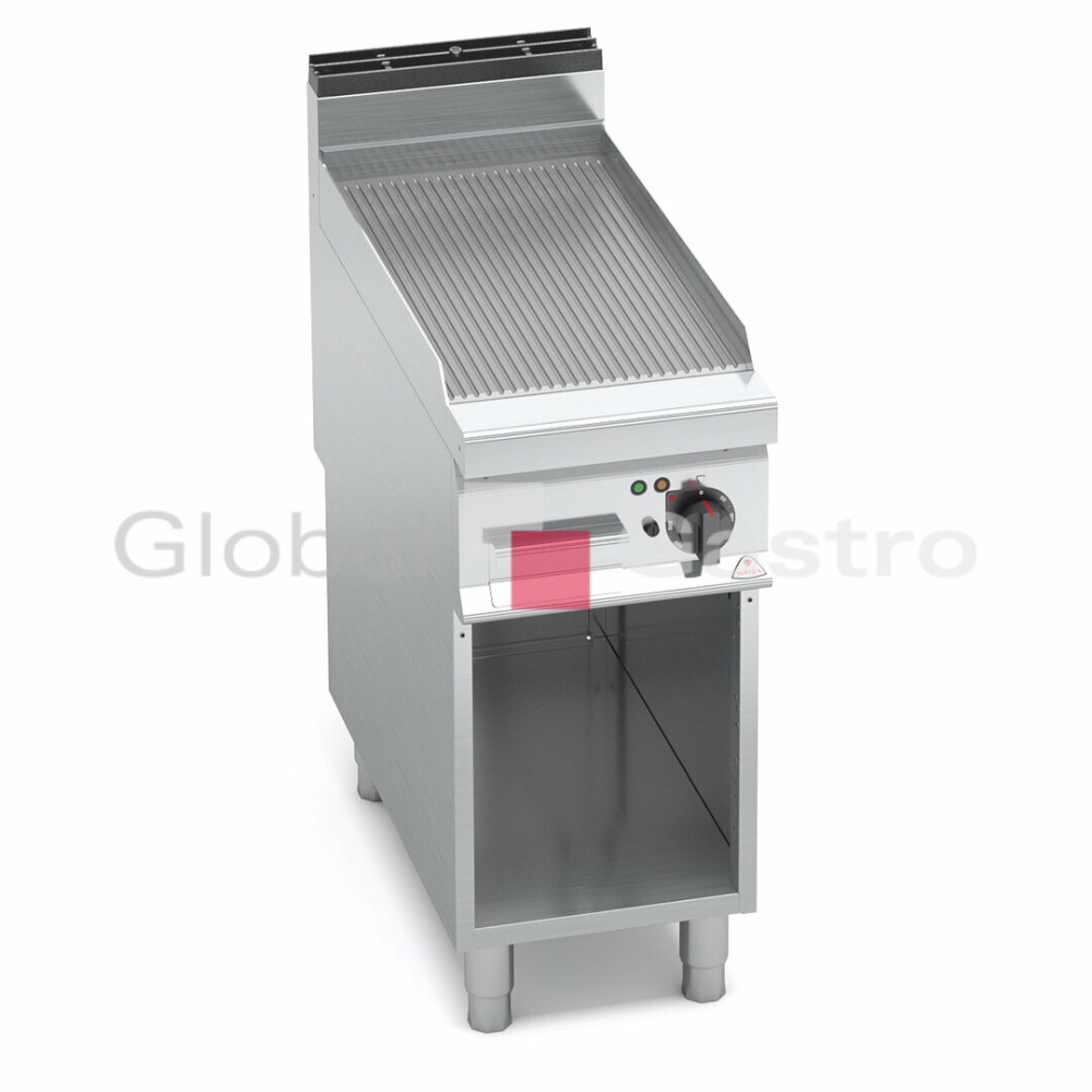 Topné těleso je umístěno pod grilovací plotnou. Deska o velké tloušťce s hladkým (rýhovaným) povrchem z oceli a zvýšenými postranními lemy. Kompaktní provedení s otevřeným podstavcem. Kompletní sortiment plynových a elektrických ploten s různým provedením grilovací plochy. Lze na nich připravovat pokrmy tzv. "kontaktem" a to nejcitlivějším způsobem. Jednotný systém distribuce tepla zaručuje rovnoměrné grilování po celé pracovní ploše, velké energetické úspory a zlepšení pracovního prostředí. Při grilování se přirozeně tvoří zbytkový olej, který je odváděna shromažďován ve velké odpadní nádobce.
