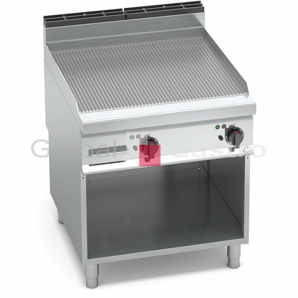 Topné těleso je umístěno pod grilovací plotnou. Deska o velké tloušťce s hladkým (rýhovaným) povrchem z oceli a zvýšenými postranními lemy. Kompaktní provedení s otevřeným podstavcem. Kompletní sortiment plynových a elektrických ploten s různým provedením grilovací plochy. Lze na nich připravovat pokrmy tzv. "kontaktem" a to nejcitlivějším způsobem. Jednotný systém distribuce tepla zaručuje rovnoměrné grilování po celé pracovní ploše, velké energetické úspory a zlepšení pracovního prostředí. Při grilování se přirozeně tvoří zbytkový olej, který je odváděna shromažďován ve velké odpadní nádobce.