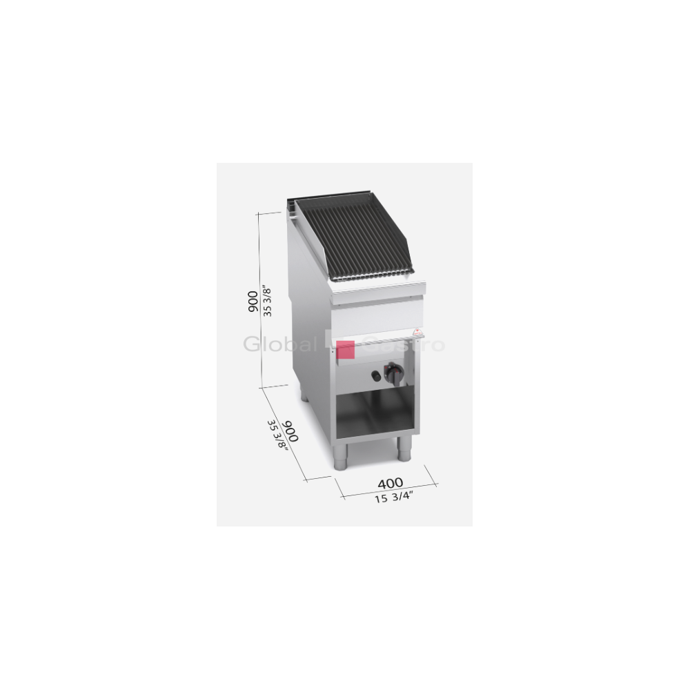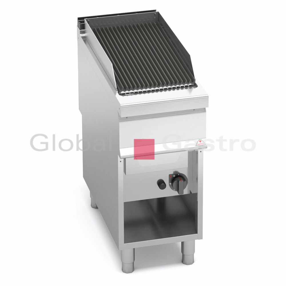 Regulace teploty ventilem s horní a dolní pozicí. Nádrž na vodu pod varnou zónou, vyrobená z nerezové oceli se zaoblenými hranami a výpustným otvorem. Univerzální grilovací litinový rošt s postraními lemy.