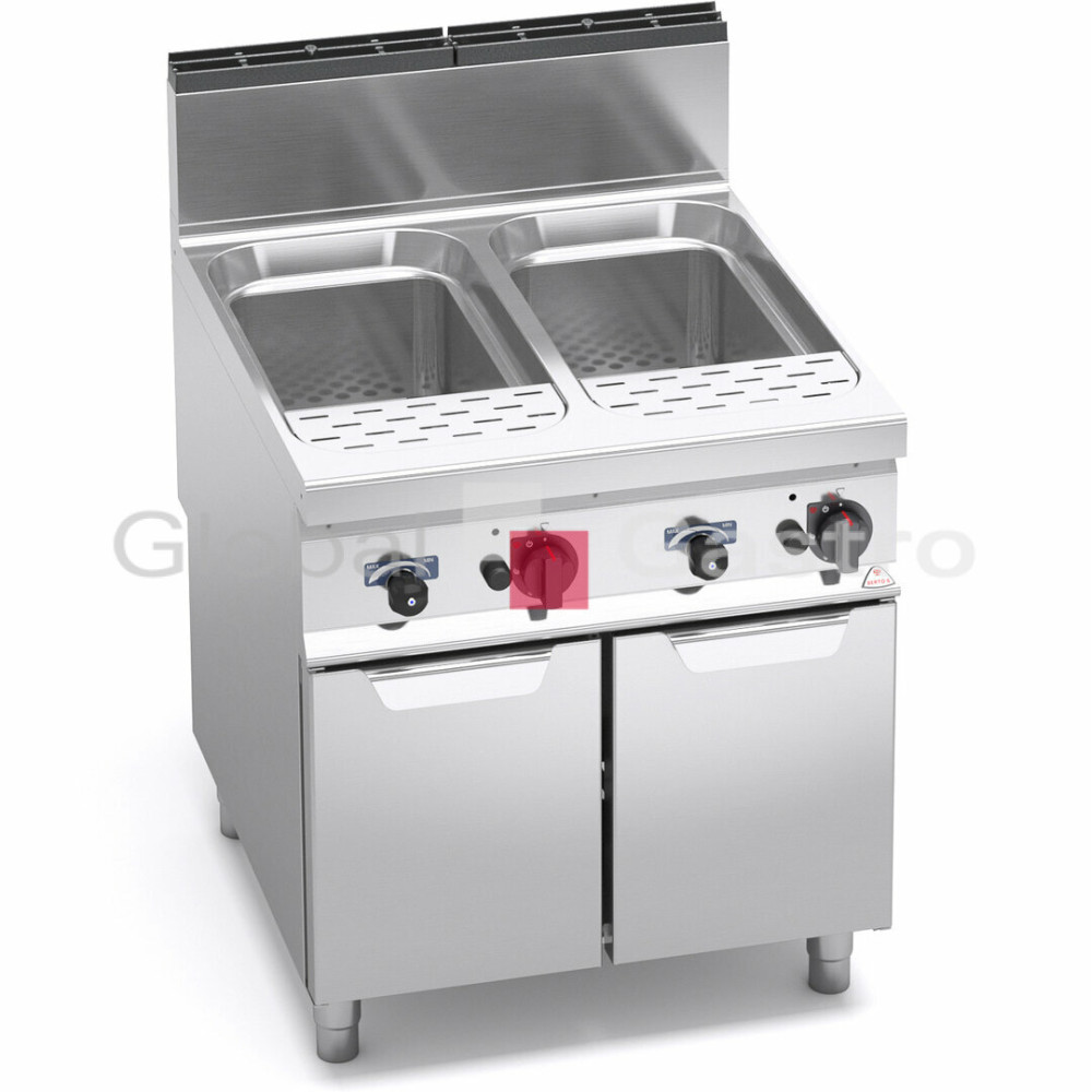 Ideální zařízení pro vaření těstovin, rýže, zeleniny a vajec díky rychlému vaření vody. K dispozici ve verzi plynové a elektrické. Přívod vody je umístěn přímo na pracovní ploše, což umožňuje snadné dopouštění, výměnu vody a odplavování nečistot přepadem. Vana je vyrobena z nerez oceli AISI 316 o objemu 40 litrů se zaoblenými hranami a vybavena vyjímatelným perforovaným dnem pro ukládání košů.