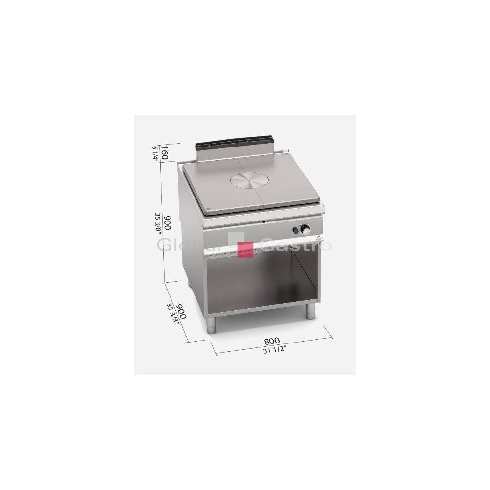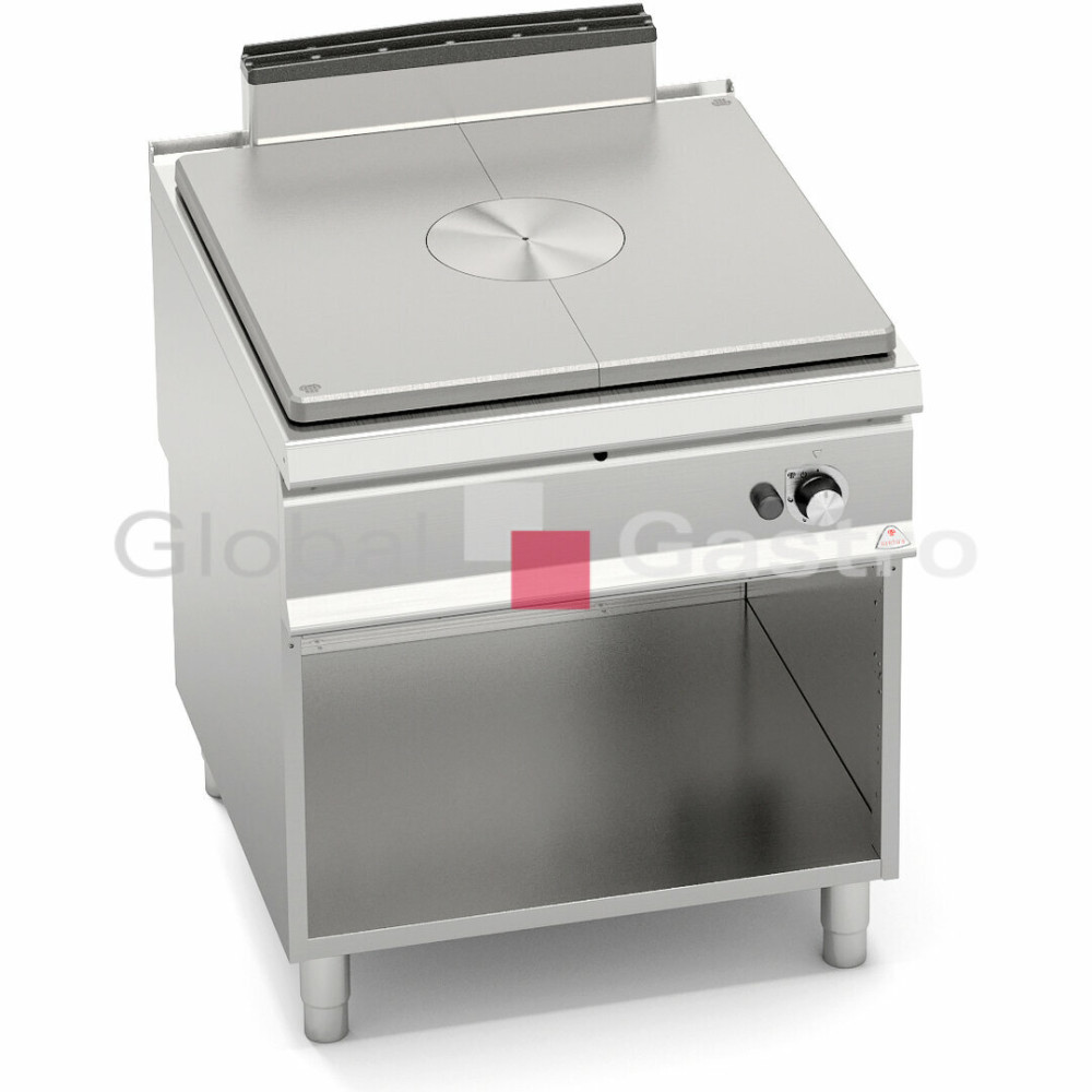 Plynový sporák s ocelovou plotnou velké tloušťky s rozdílnými oblastmi teplot: max. teplota na středu, klesající na okrajích. Ohřev zajišťuje střední litinový hořák s regulací výkonu do 13 kW vybaven pojistným termoventilem, piezoelektrické zapalování, izolační vrstva Vermikulit v komoře hořáku zaručuje vysokou účinnost. Kompaktní provedení s otevřeným podstavcem. Zvýšený odtah 120 mm není součástí !