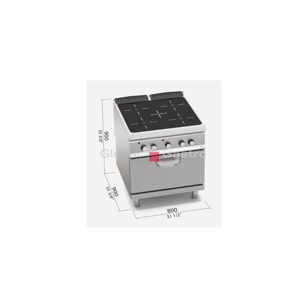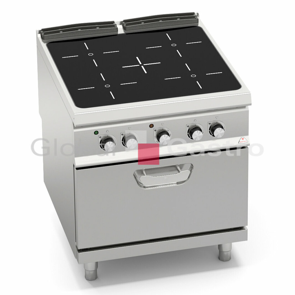 Keramická varná deska tloušťka 6 mm. Elektrická topná tělesa Ø270 mm, výkonu 4kW pracují v kruhových varných zónách. Plochy zón jsou označeny speciálním serigrafem, dle kterého je určena správná poloha hrnce. Světelná signalizace zbytkového tepla do 60°C při vypnutí každé zóny pro ochranu uživatele. Kompaktní provedení s elektrickou horkovzdušnou troubou GN 1/1.