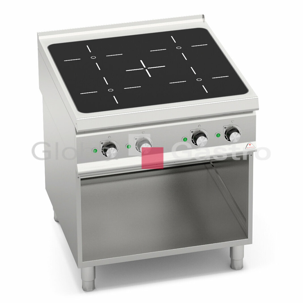 Keramická varná deska tloušťka 6 mm. Maximální úspora energie, vytápění varné plochy je pouze při kontaktu hrnce s varnou plochou. Velikost topných zón je samo-regulovana podle průměru nádobí. Při odstranění nádobí z povrchu je automaticky přerušeno vytápění. Elektronická regulace teploty je prováděna potenciometrem. Kompaktní provedení s otevřeným podstavcem.